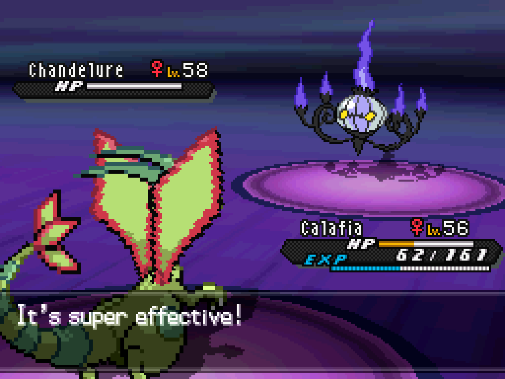 Chandelure beats Woshua easily, but gets smashed to pieces by Calafia’s Rock Slide.
