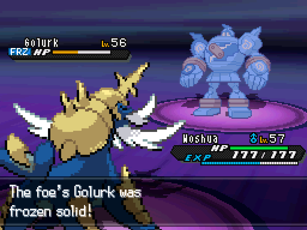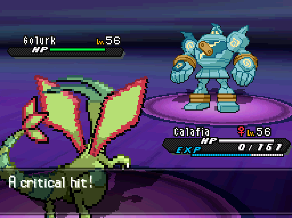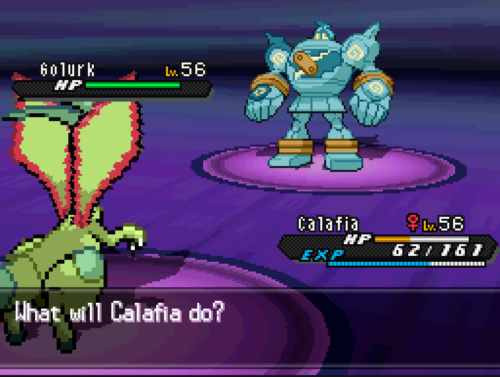 Golurk is… a problem.  It’s another physically tough enemy, and Calafia will struggle to beat it with Rock Slide.  Artemis only has Strength, so they’re dead weight, and Magic Joe has been advancing quickly but is still only level 46 – not high enough to stand a chance of wearing Golurk down with Toxic.  I don’t think I have any choice but to do a combat revive on Woshua.