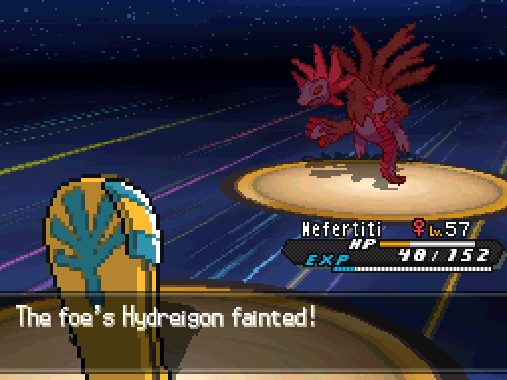 Easy enough for Nefertiti to finish this off.  The Elite Four aren’t super difficult in this generation; they only have four Pokémon each, rather than five as in most other games.  Still, an Ace and a Four can make practically anything complicated.