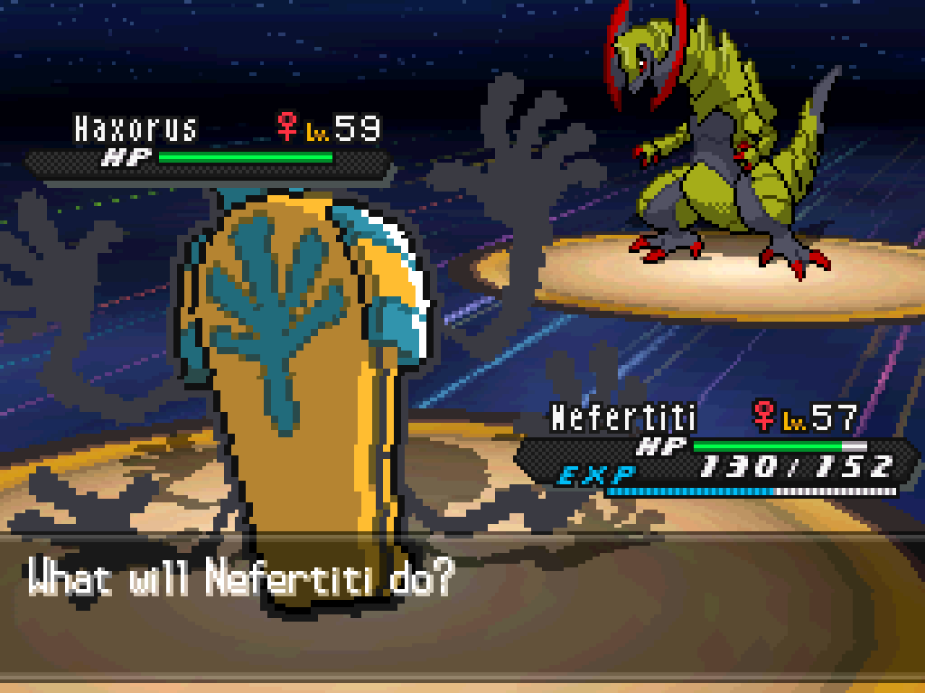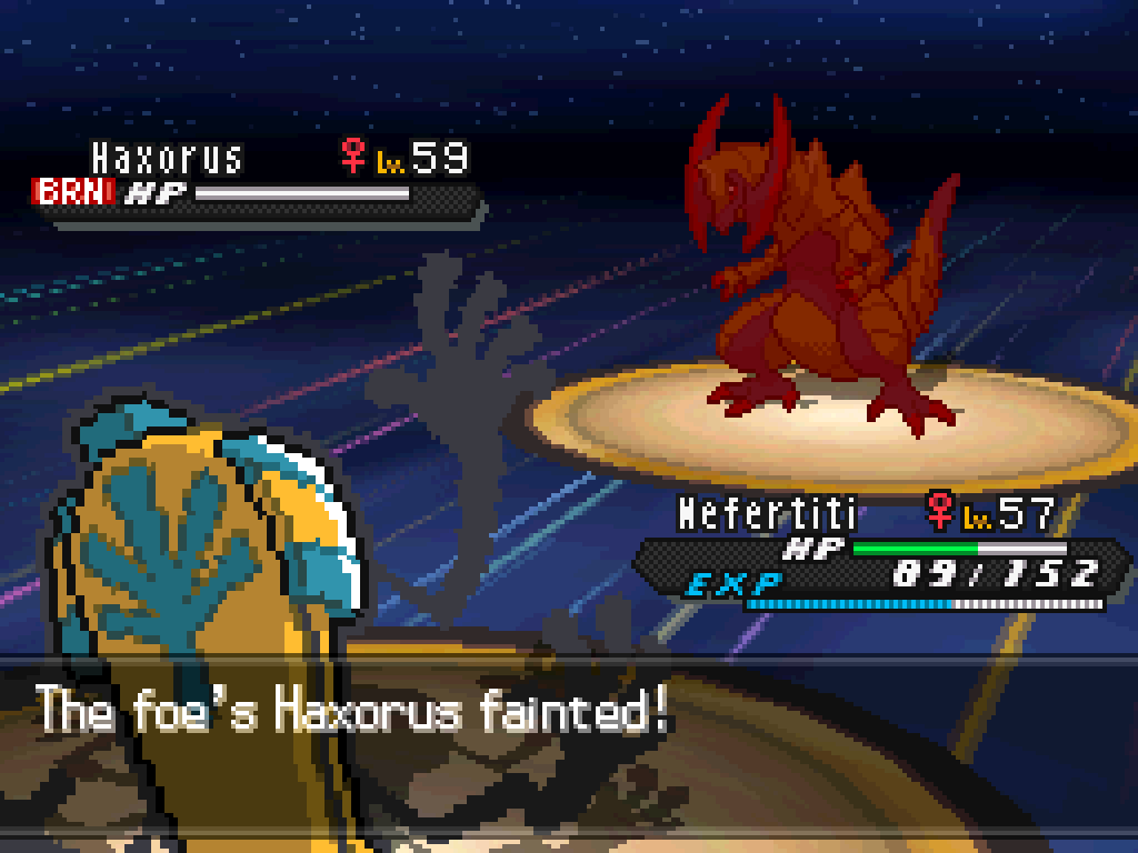 Okay, it turns out even with a Dragon Dance boost, a burned Haxorus cannot overcome Nefertiti’s ridiculous gold-plated armour.  This is, uh… honestly going much better than I expected.