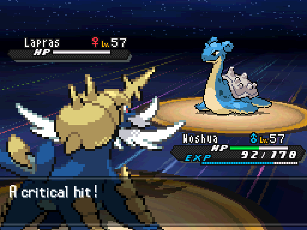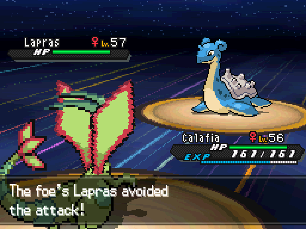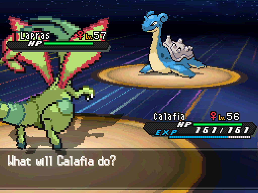Uh… I’m supposed to return to using Pokémon in party order, but Nefertiti is now in what was Calafia’s spot… so I guess it’s Woshua’s turn. I think Iris’ Lapras knows Thunderbolt, so I’m not super optimistic here…