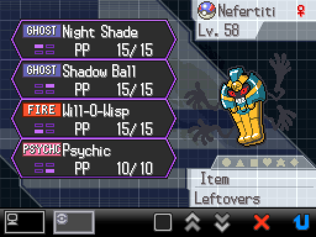 That leaves us with Nefertiti, who isn’t an obvious candidate for this job, but can burn Bisharp to weaken its attacks and then chip away at it with Night Shade.  It takes some healing from me, but she’s able to wrap this up.