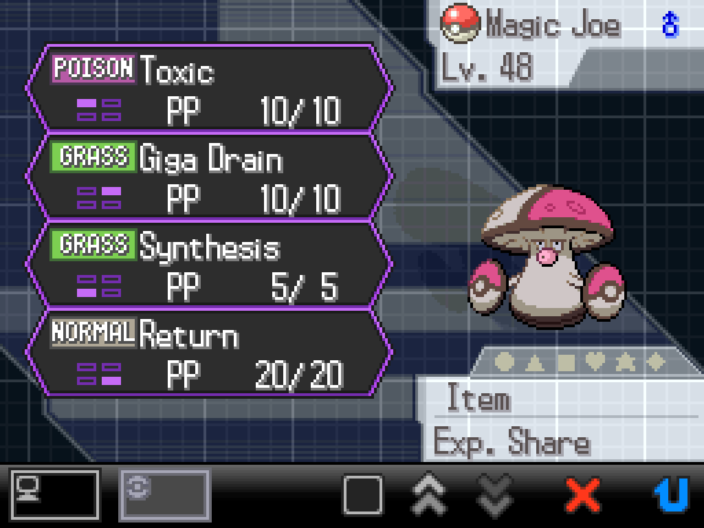 I have to use Magic Joe until he’s level 56; after that, Lieutenant Derby can return to active duty and Magic Joe can go back to the box (if I even want him to), but the cycle will start again with whoever my new highest-level and lowest-level Pokémon are.  I’ll just slap an Exp. Share on him for now.