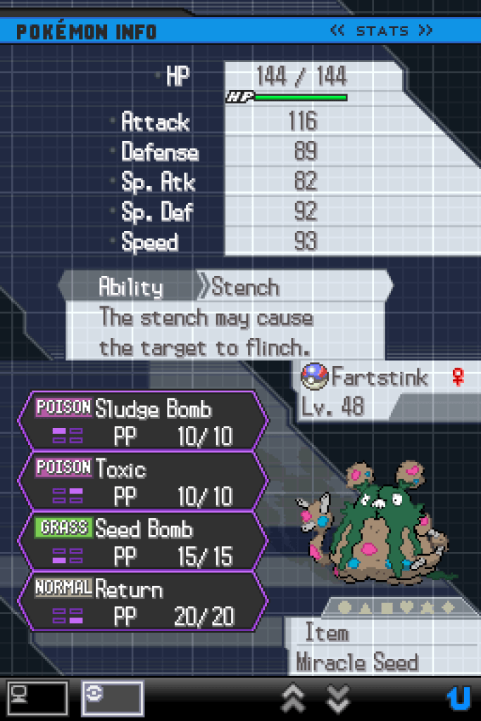 Fartstink returned to her simple home on the outskirts of Castelia City, where she tended to her garden for the rest of her days. She never went on another adventure again, always protesting that she was much too old for such things and that her back couldn’t take it. However, she always looked back fondly at her time in the spotlight as a legendary champion and cherished her many young friends, who visited her often for her worldly wisdom or simple conversation. Her life would never be as exciting as it had been for those brief few weeks, but nor would it ever be boring, or lonely.