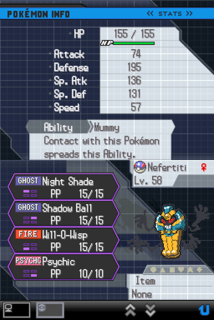 Nefertiti quickly forgot that she had been deposed as Unova’s malevolent supernatural tyrant and continued to demand blood offerings and fancy chocolates from anyone who would listen. Most people, it turned out, were less willing to obey without the threat of region-wide spiritual calamity on the line. However, she found an anchor in her young lover Shoal, who had been totally on board with ruling the Unova region with an iron fist and a bloody sacrificial blade, but recognised that a less active lifestyle was probably better for Nefertiti in the long run. Together they rebuilt the ancient death-cult that Nefertiti had served when she was alive, and were able to gather a surprising number of followers (as well as some choice luxuries) by granting magical powers to any who would pledge them their souls. Their cult grew slowly, but their enemies were mortal – they could afford to take a long view.