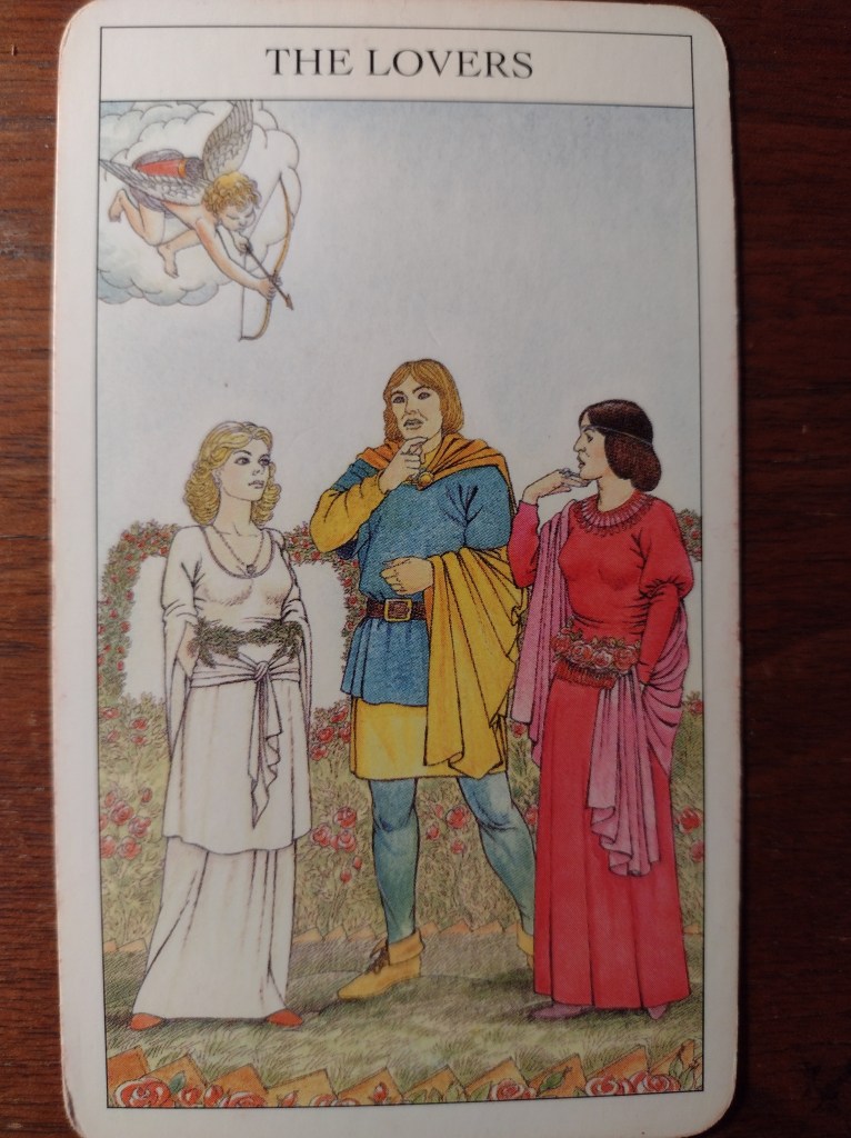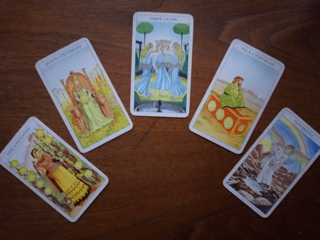 Nine of Pentacles… the hard work that’s brought us – and Vasya and Eleanor – to this point… the Queen of Pentacles… but there are two Queens of Pentacles, two rival claimants to the throne… and how could that be resolved, except through… the Three of Cups! A card representing a joyful occasion in the realm of relationships and emotions… like a royal wedding… Each giving up their exclusive claim, making the material political sacrifice implied by the Four of Pentacles to achieve a greater good: the compromise, balance and harmony represented by Temperance!
