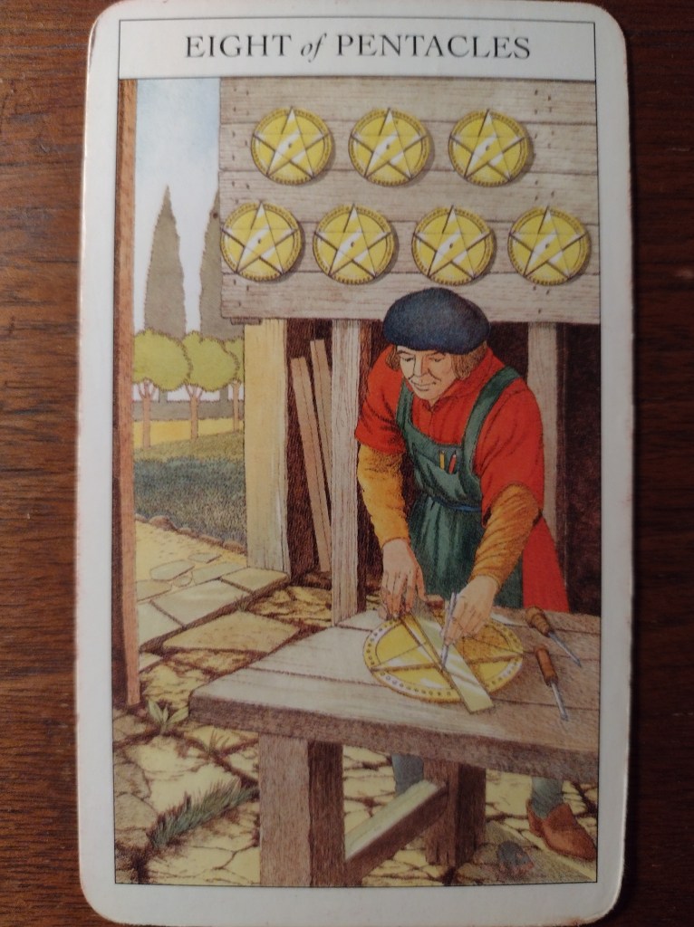 And the advanced variant for the Eight of Pentacles, which I don’t think we’ve seen yet, is: