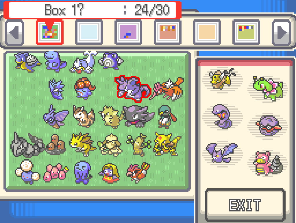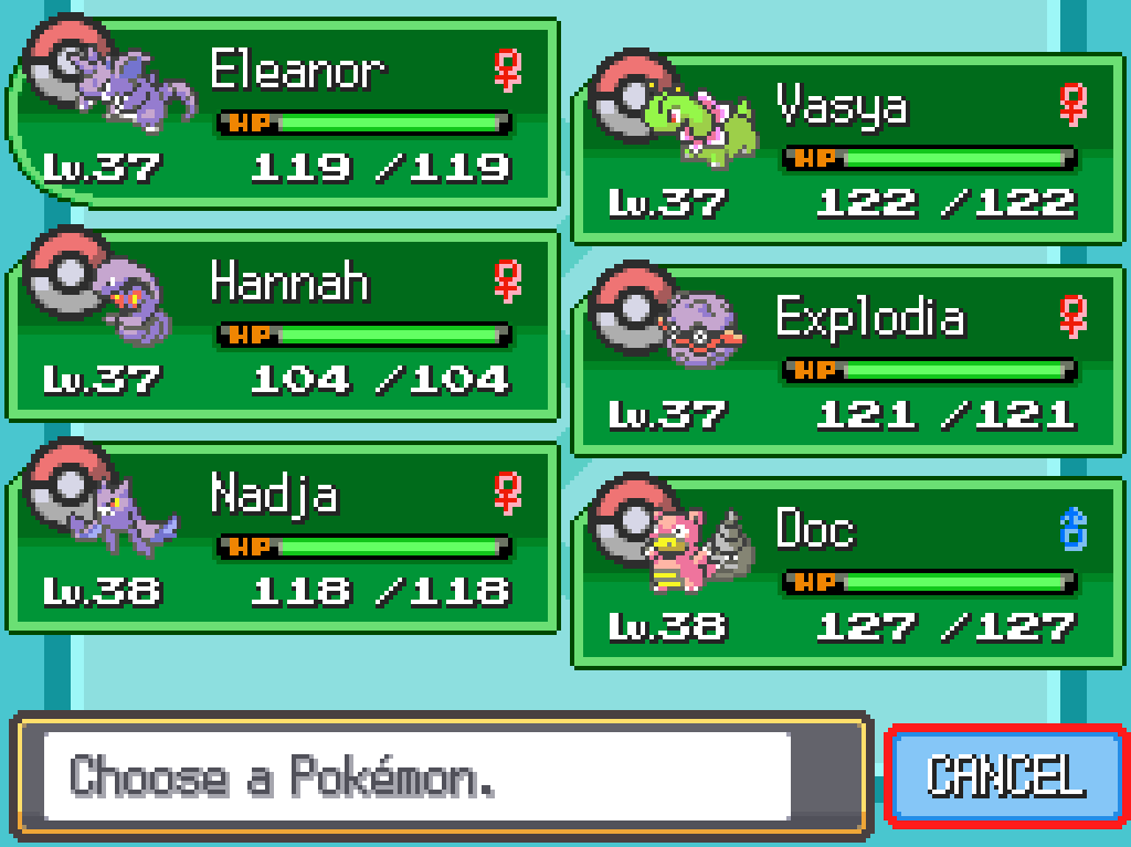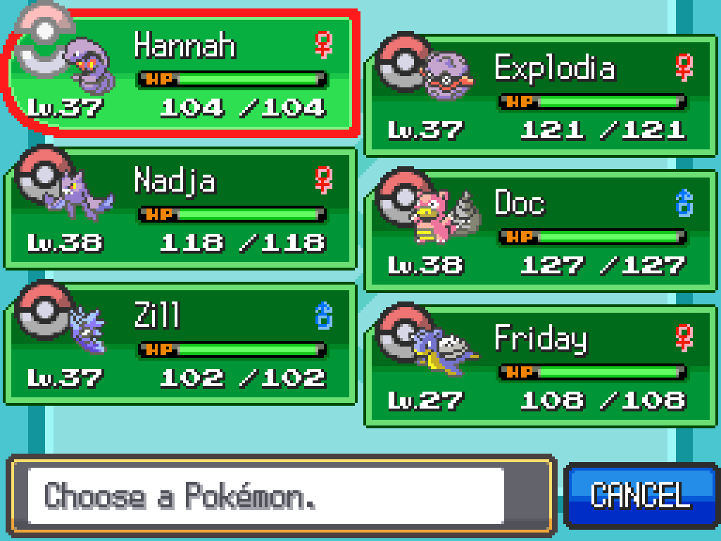 I’m starting off this leg by just… putting a whole lot of Pokémon through basic training. Thanks to the King of Swords, all my lower-level Pokémon can ignore the rules and do whatever they want until they hit 31, and there are actually a lot who can evolve before that point.
