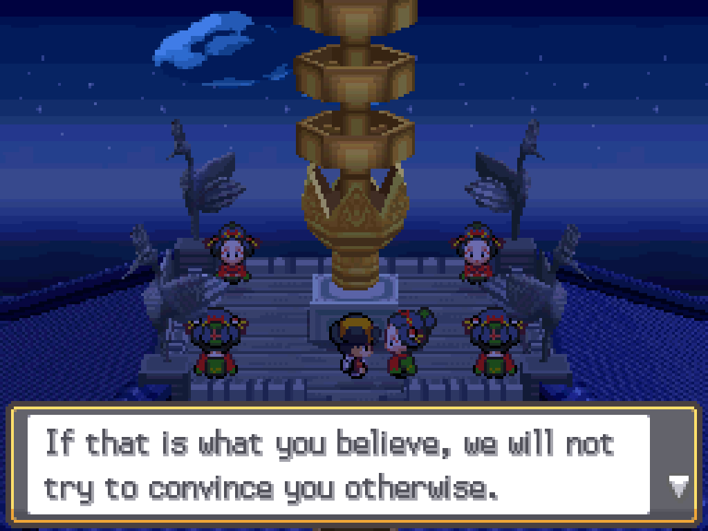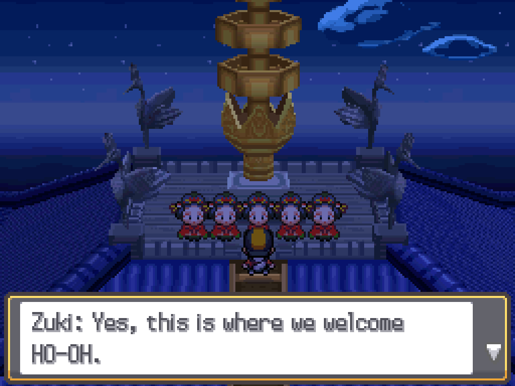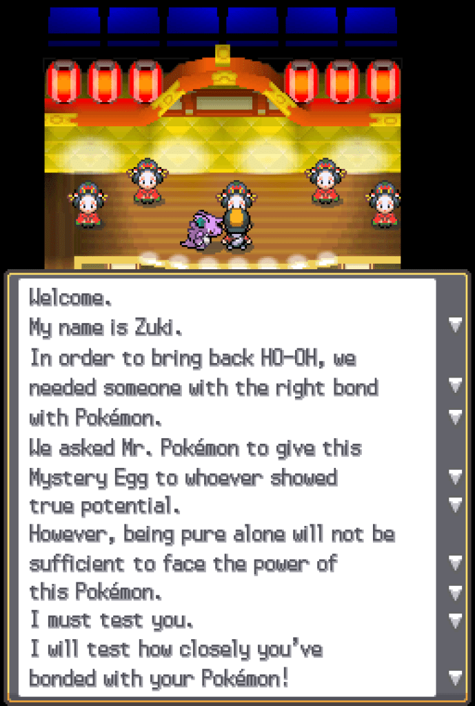 This is a really interesting line from Zuki that I think may have slipped under the radar for a lot of people, because she only says it if you bother to speak to her (rather than just immediately reloading your game) after defeating Ho-oh or Lugia without catching it. It seems like Zuki thinks this outcome is not a failure on the player’s part, but a choice – that you’ve chosen to banish Ho-oh rather than capture it because you actually disagree with her goal of bringing the legendary Pokémon back to Johto. Which… honestly, is a real big-dick-energy roleplay move if you choose to own it.