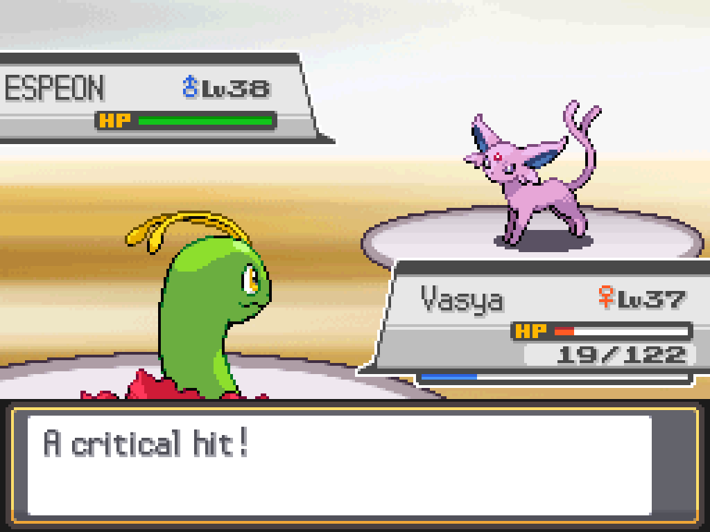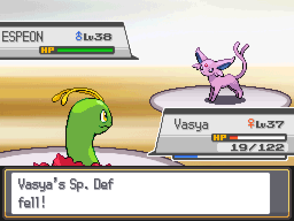 Oof; real insult to injury with the special defence drop on top of the critical hit. Vasya might have been able to draw this out with Synthesis if not for the crit, but it looks like neither of our queens will be a match for this one. Fortunately, all I have left now is Champions, so I can just pick the best one to send in…