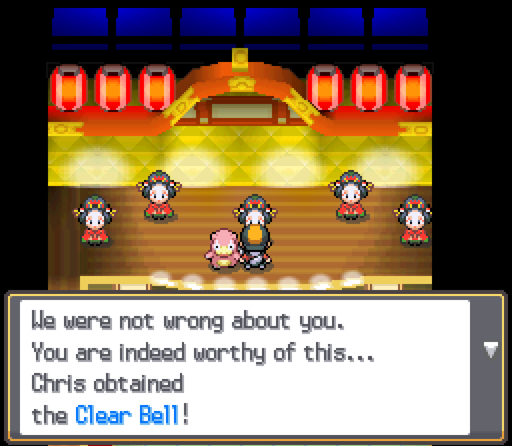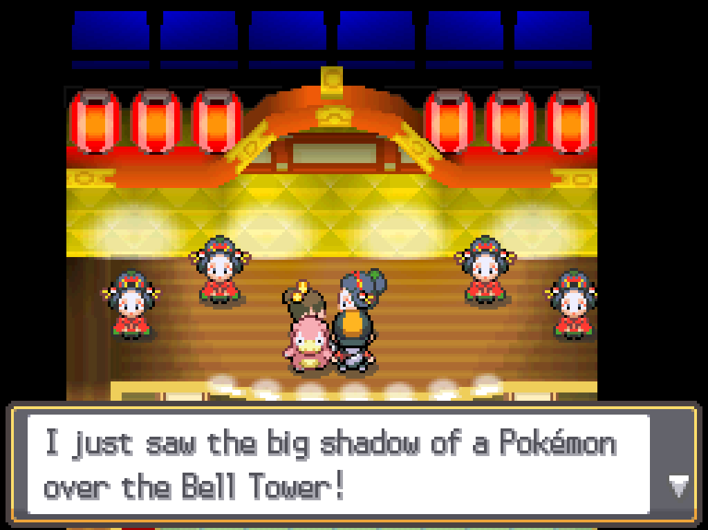 We’ve passed the Kimono Girls’ test and earned the Clear Bell, and it seems someone is waiting for us at the pinnacle of Ecruteak City’s Bell Tower.