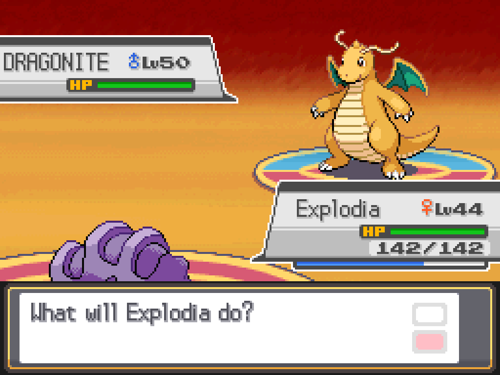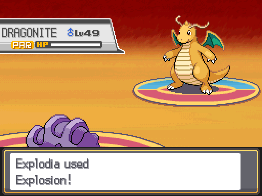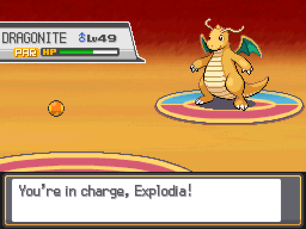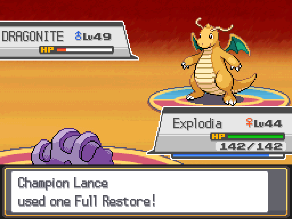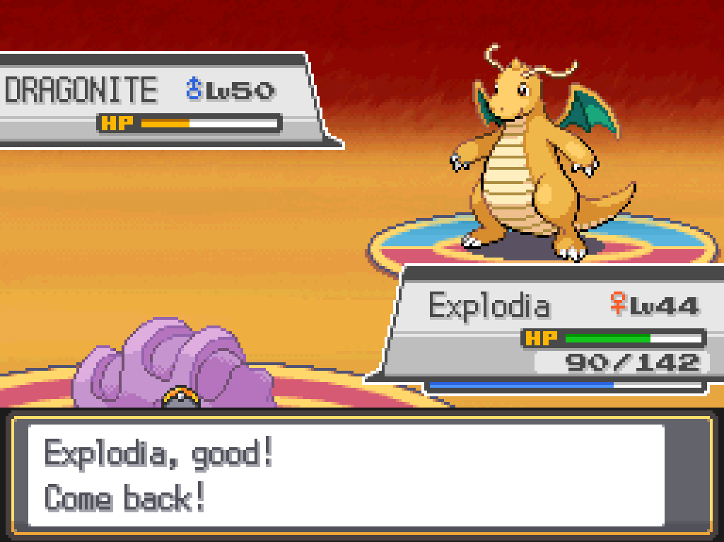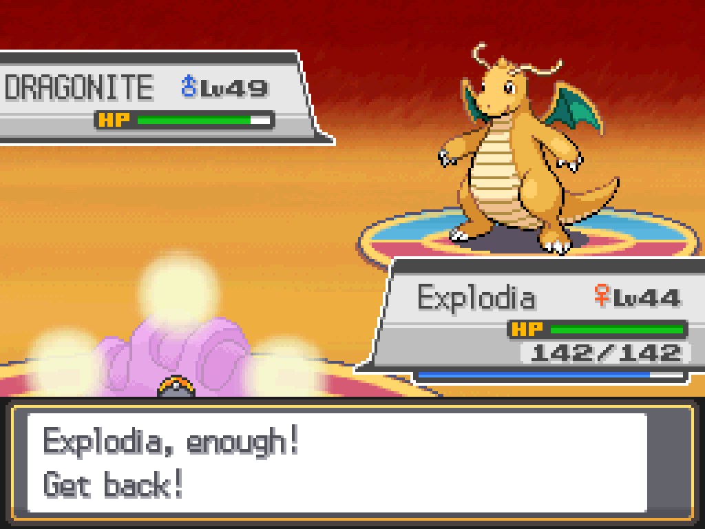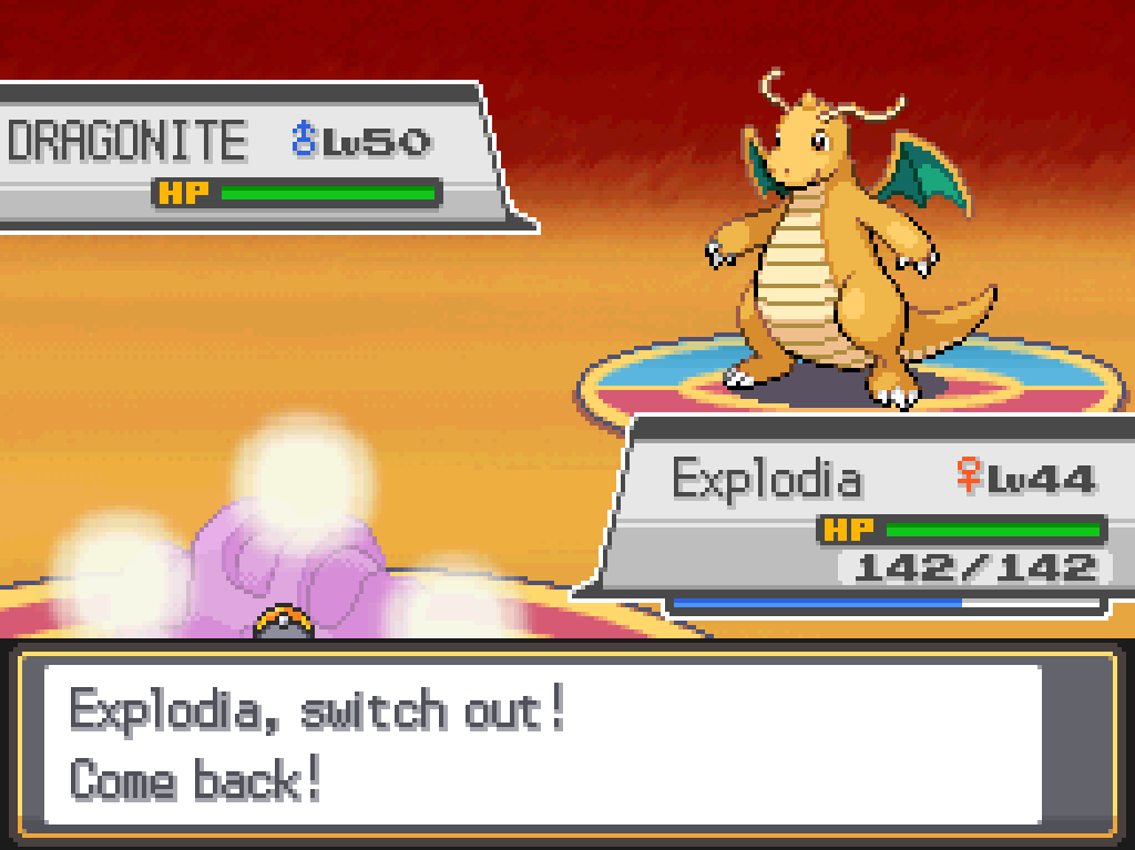 oh, $#!t, it’s this one; I switched to Explodia because I thought Lance would open with one of his lower-level Dragonite, but it’s the big one. Better switch out before…