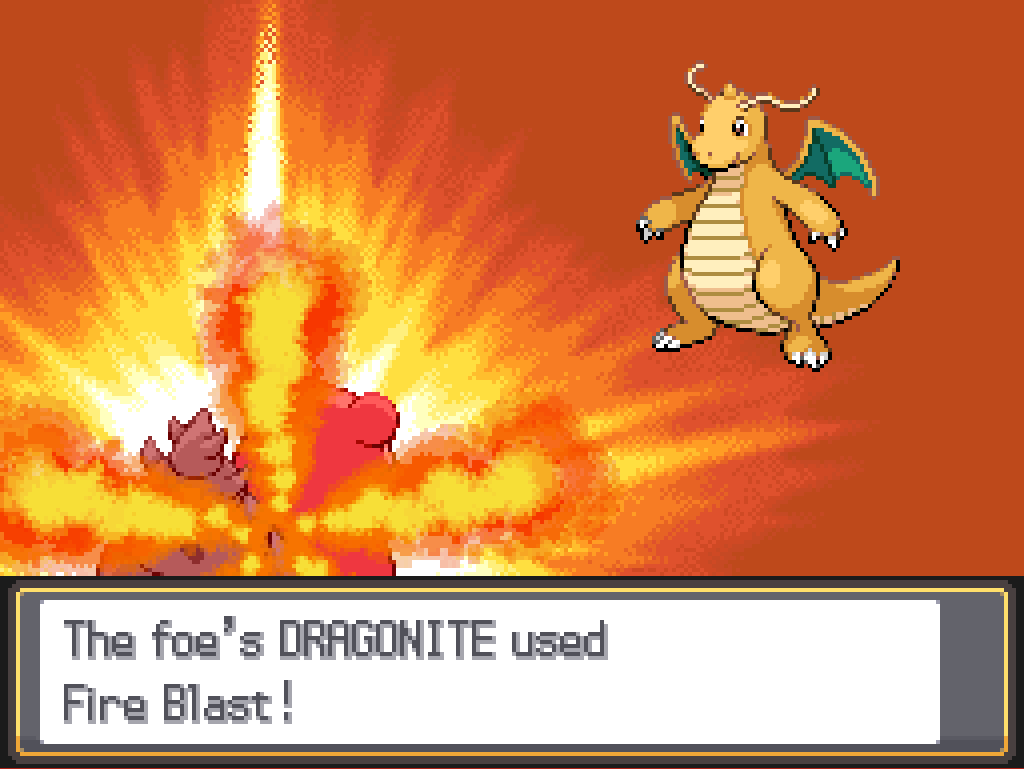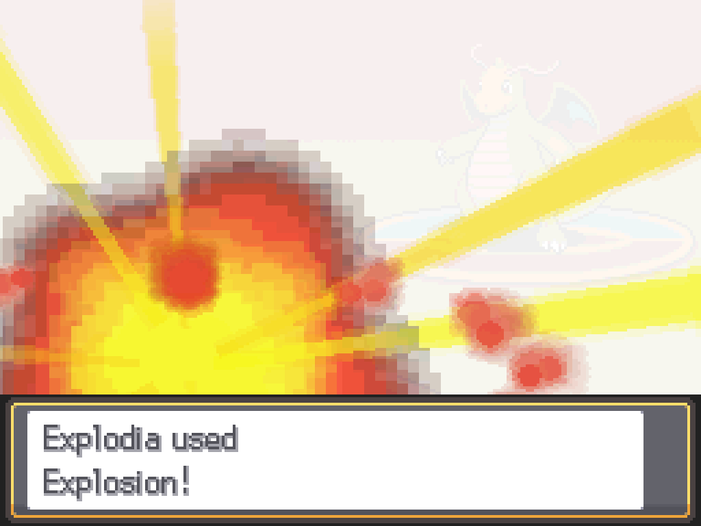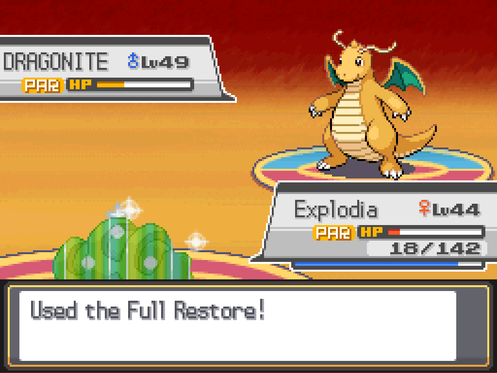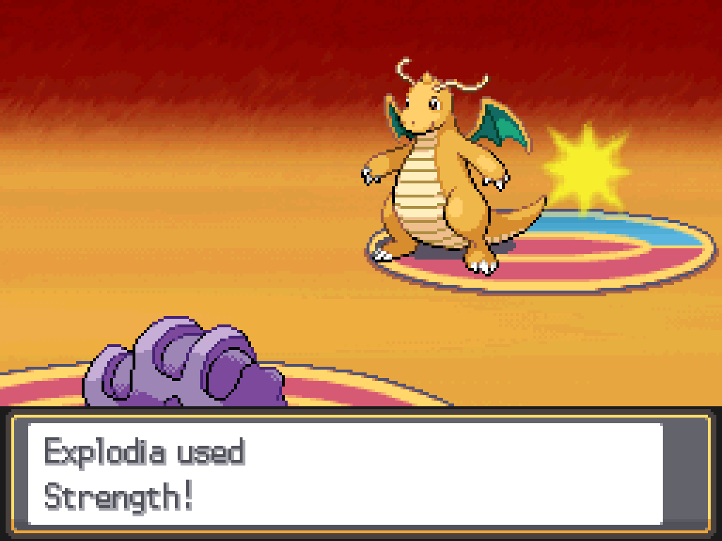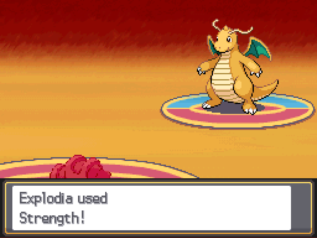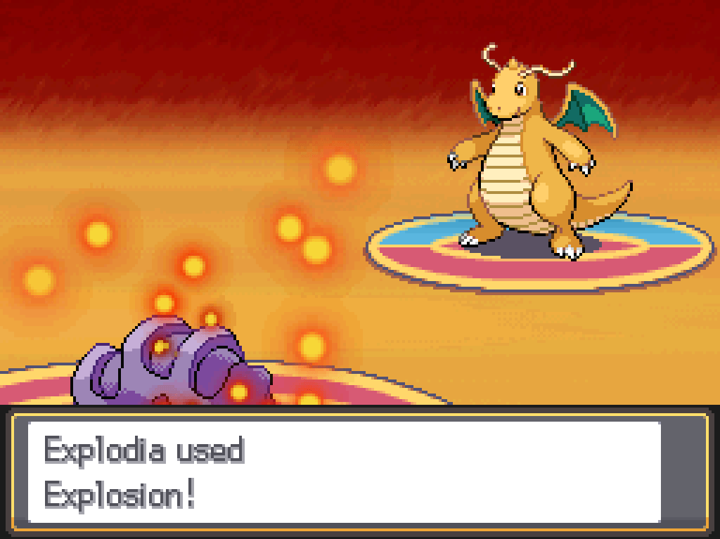 oh, $#!t, it’s this one; I switched to Explodia because I thought Lance would open with one of his lower-level Dragonite, but it’s the big one. Better switch out before…