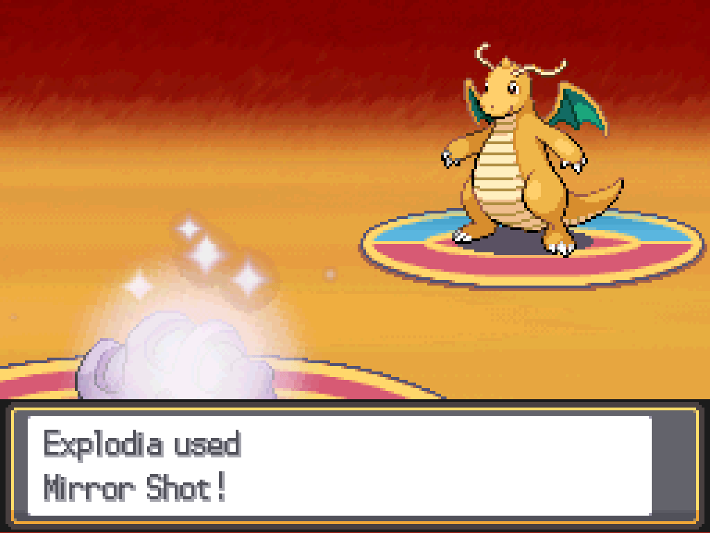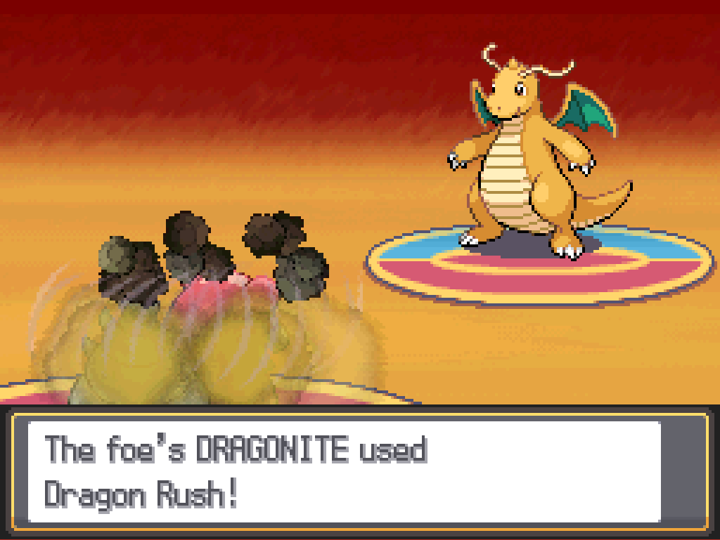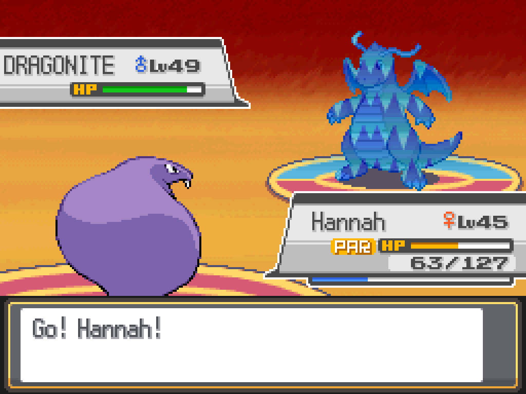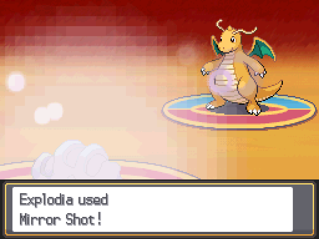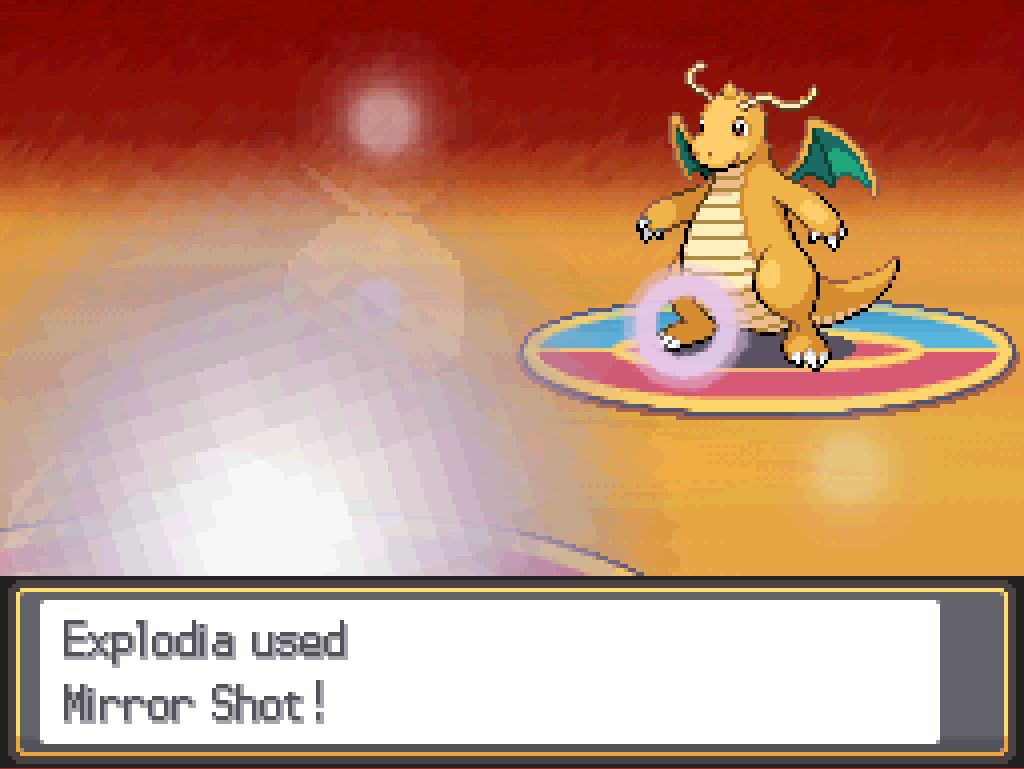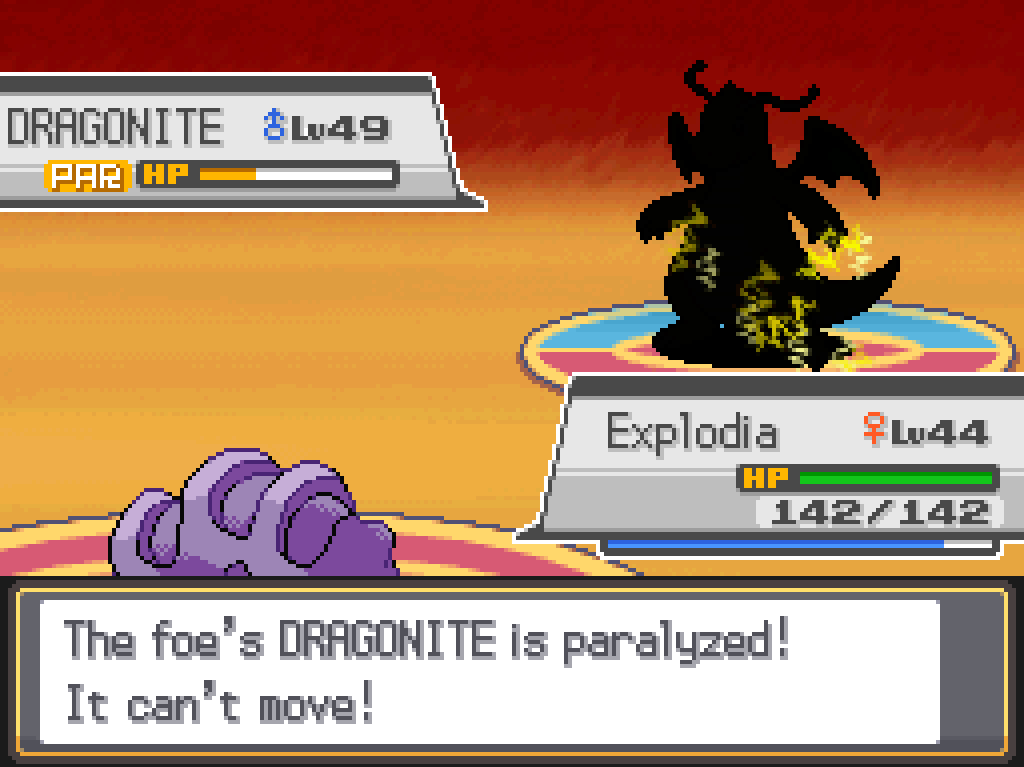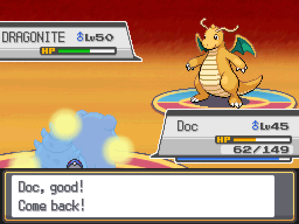 oh, $#!t, it’s this one; I switched to Explodia because I thought Lance would open with one of his lower-level Dragonite, but it’s the big one. Better switch out before…