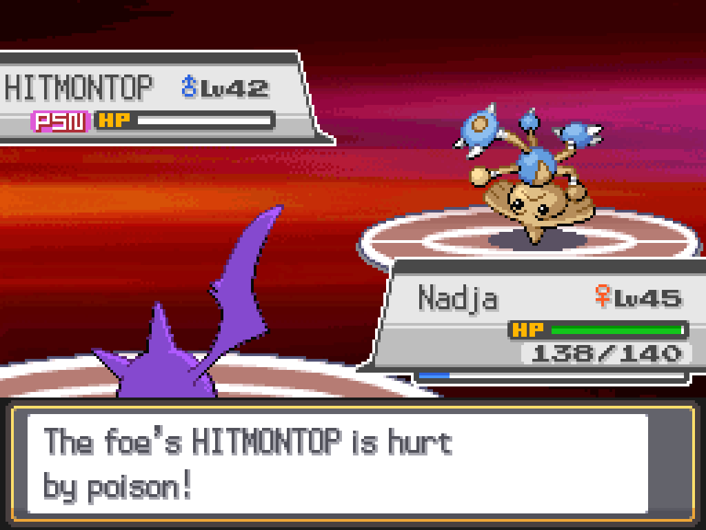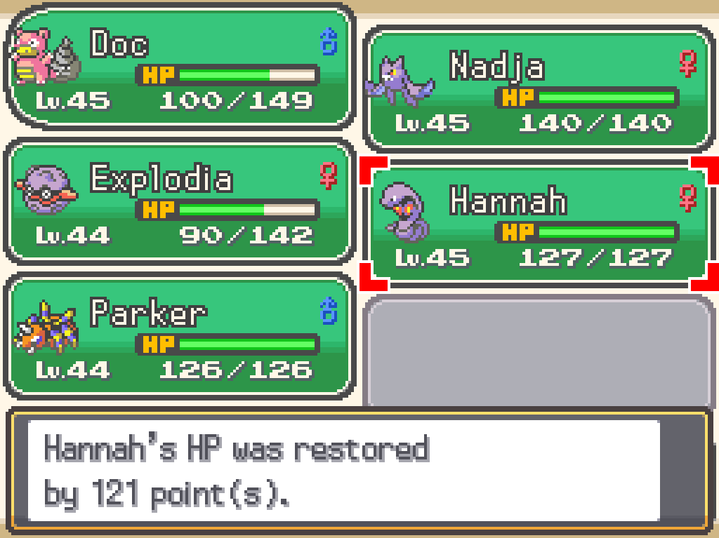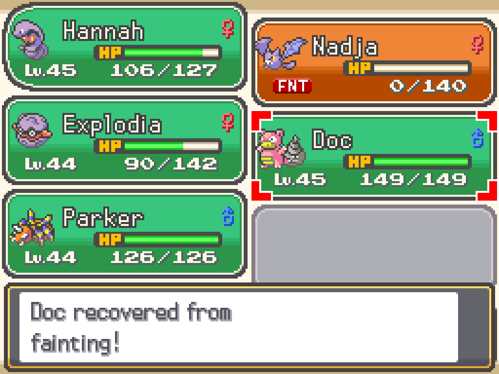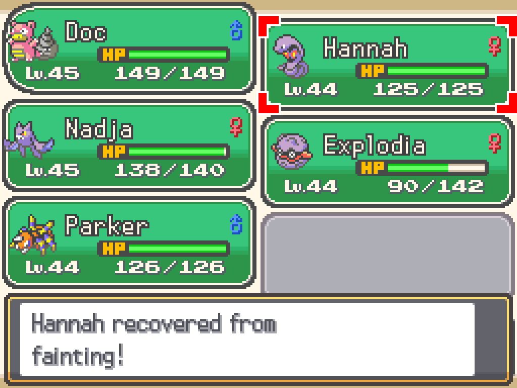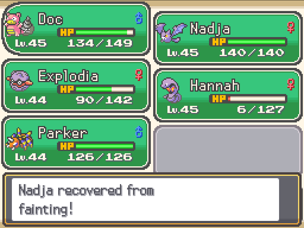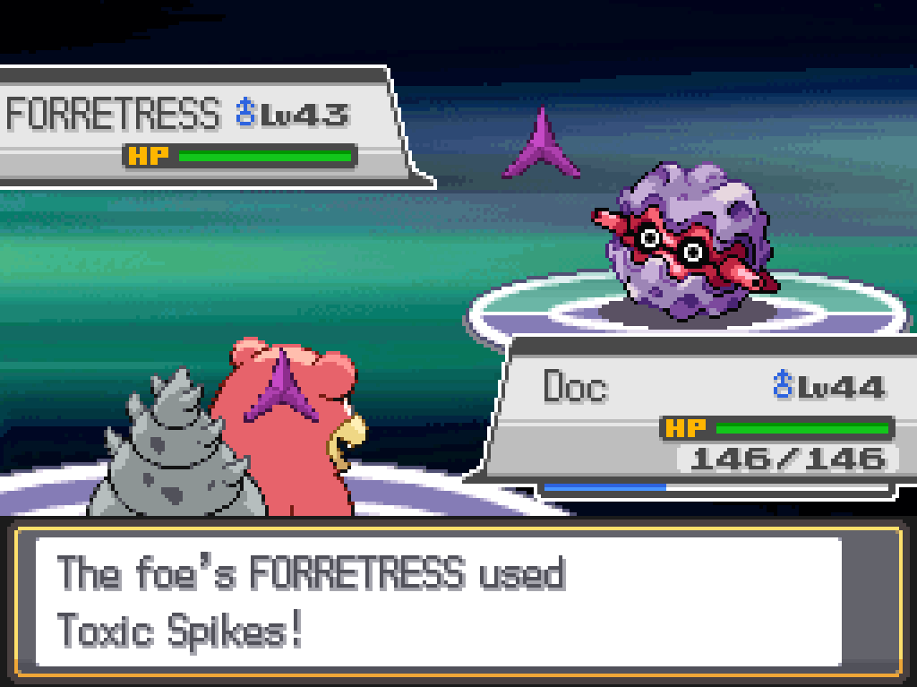 Forretress, like Bronzong in Diamond and Pearl, can be a huge pain if you don’t have Fire attacks, but if you do it’s barely a footnote. Those Toxic Spikes won’t even do anything: Doc’s already in play, Nadja and Explodia ignore them, and Hannah and Parker (as “grounded” Poison-types) can actually absorb Toxic Spikes and take them off the field altogether.