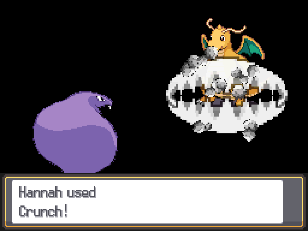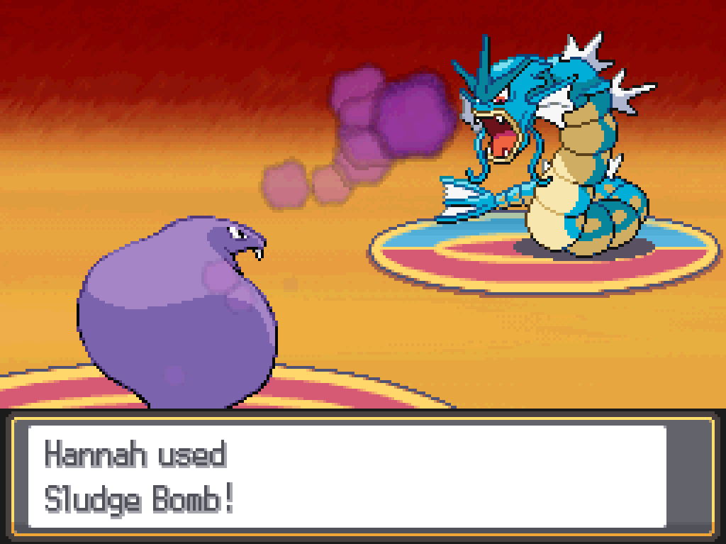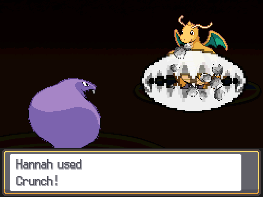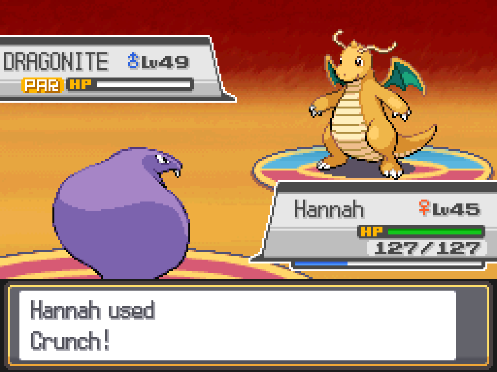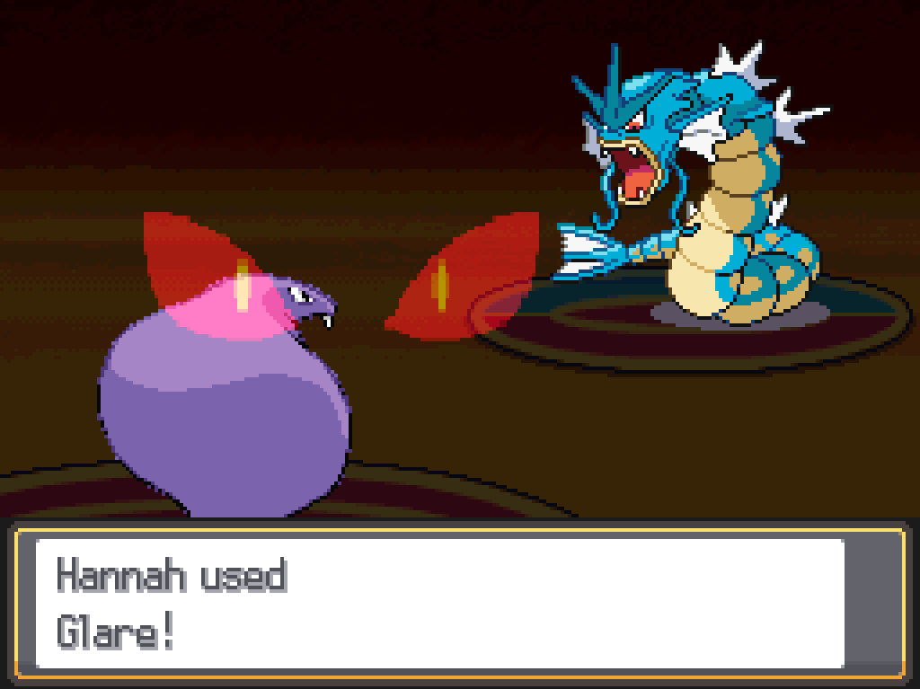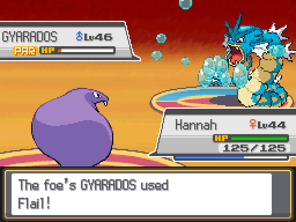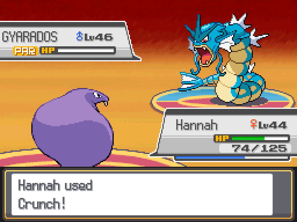 Intimidate and Glare blunt a lot of what Gyarados can do, but this is still a long fight that eats up a six-pack of potions and a big chunk of Hannah’s remaining PP for Crunch and Sludge Bomb (she has some Earthquakes left too, but every member of Lance’s team is a Flying-type, so they’re no good to us).