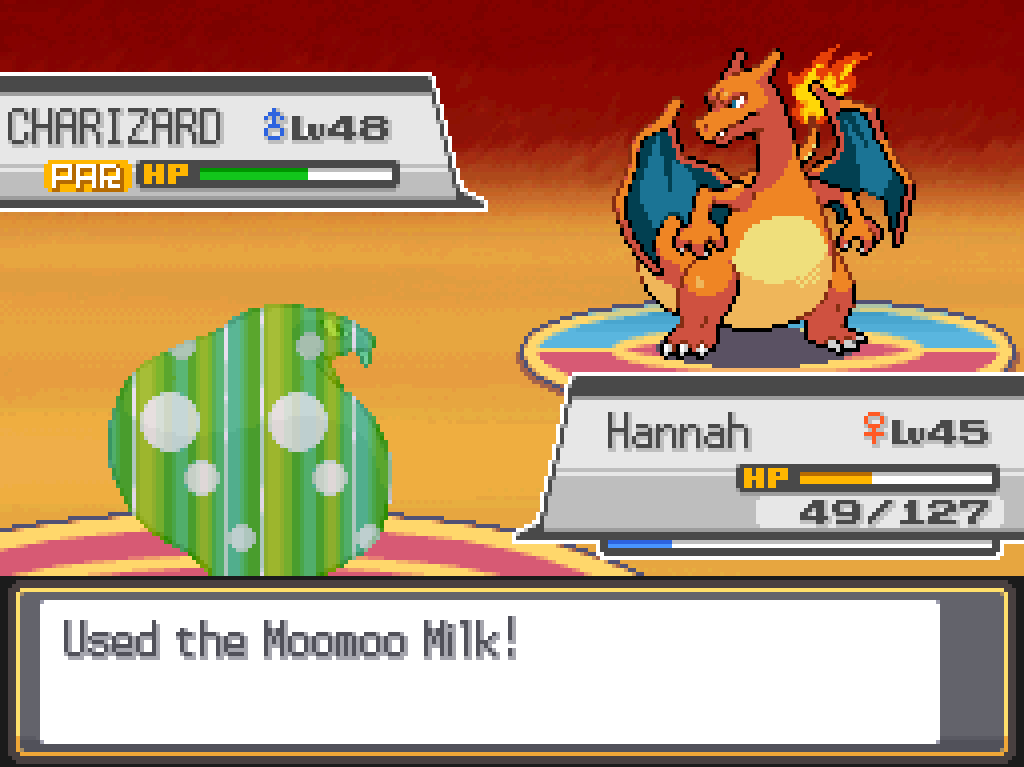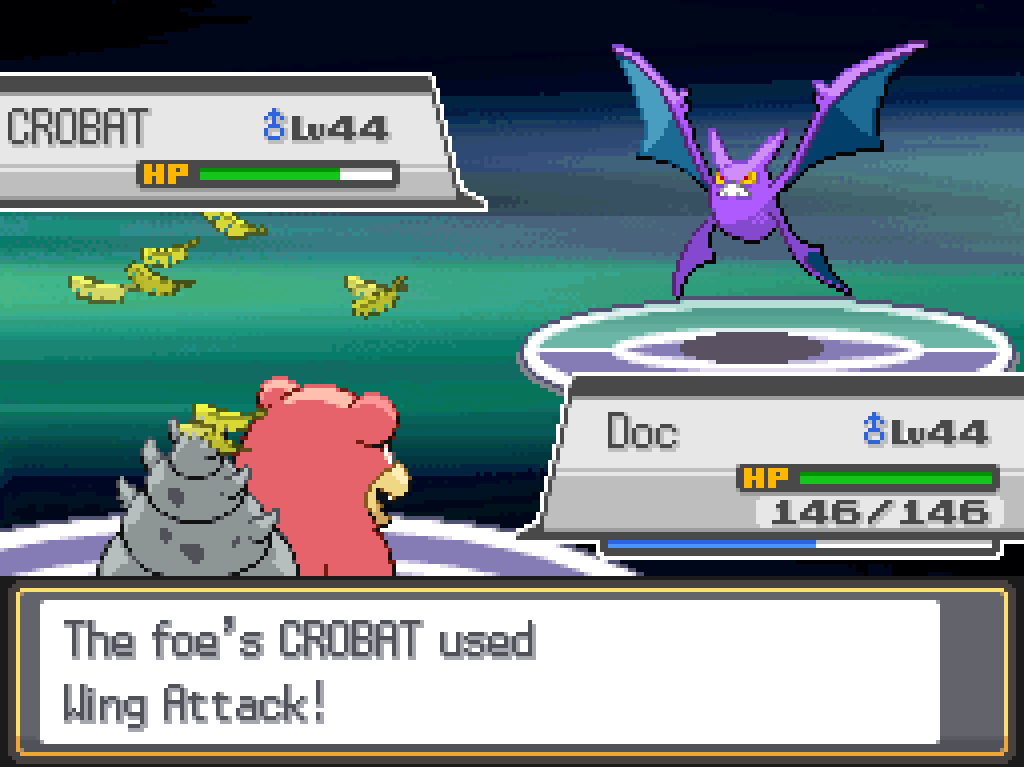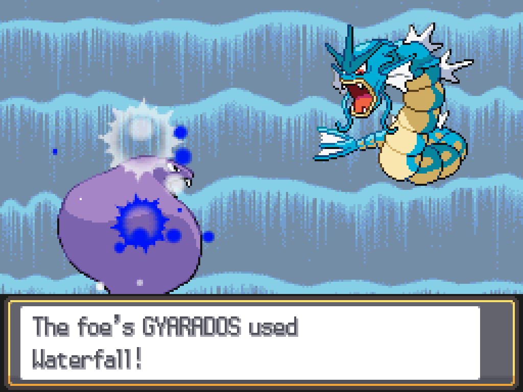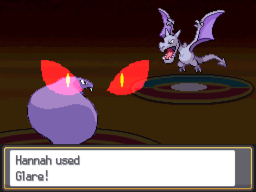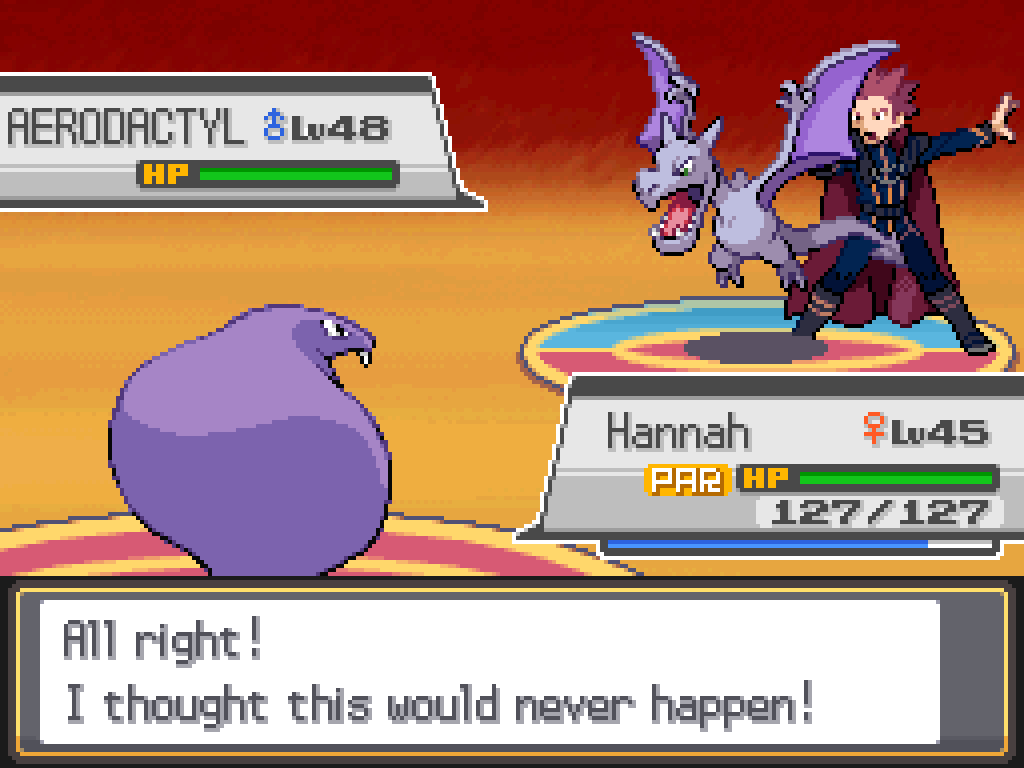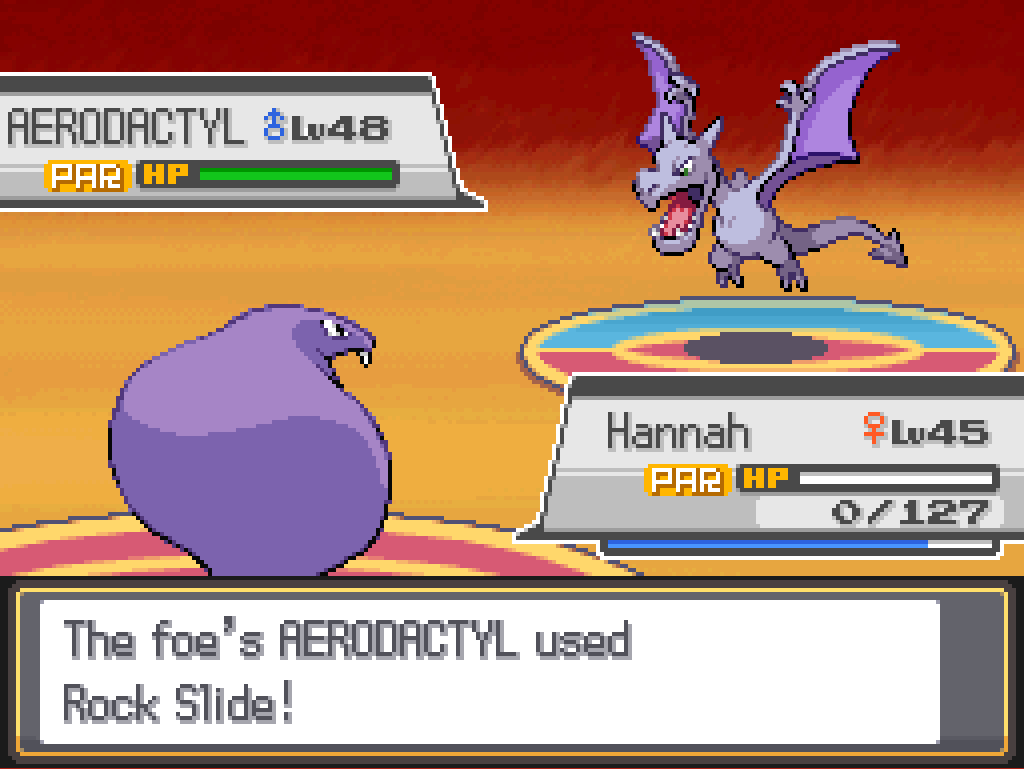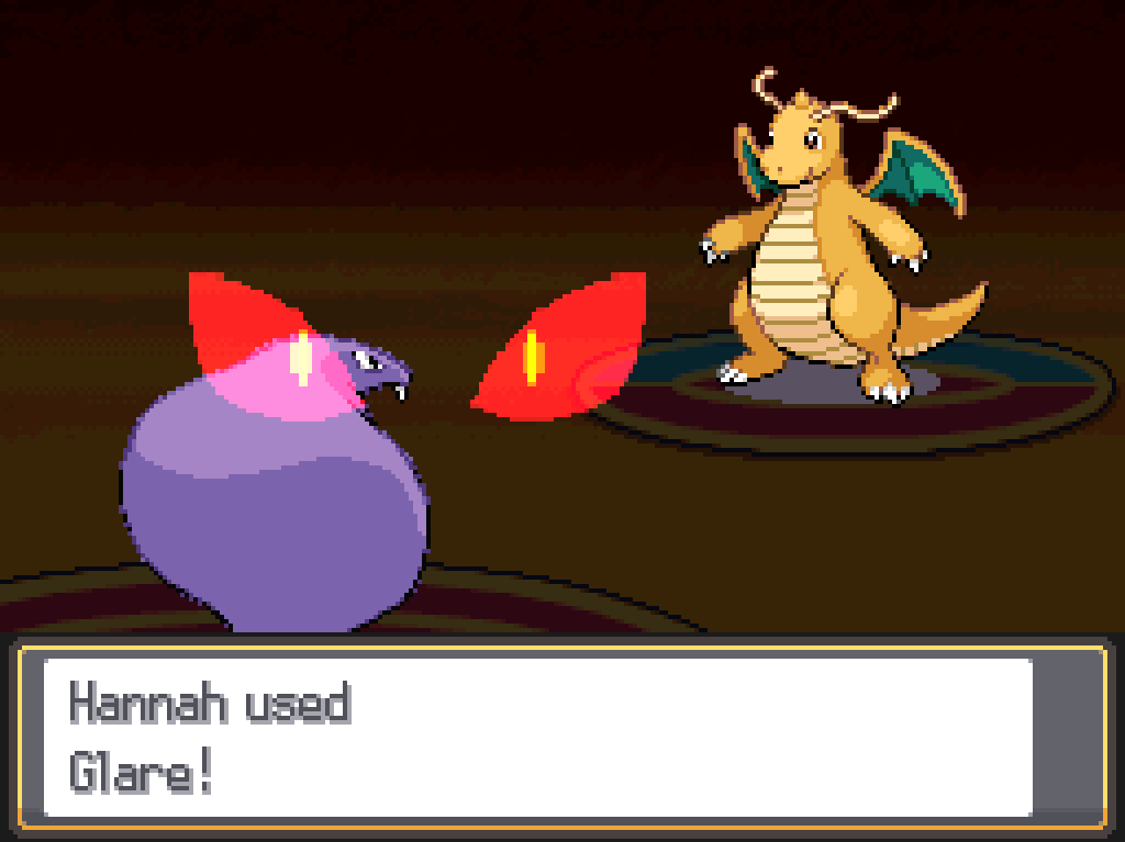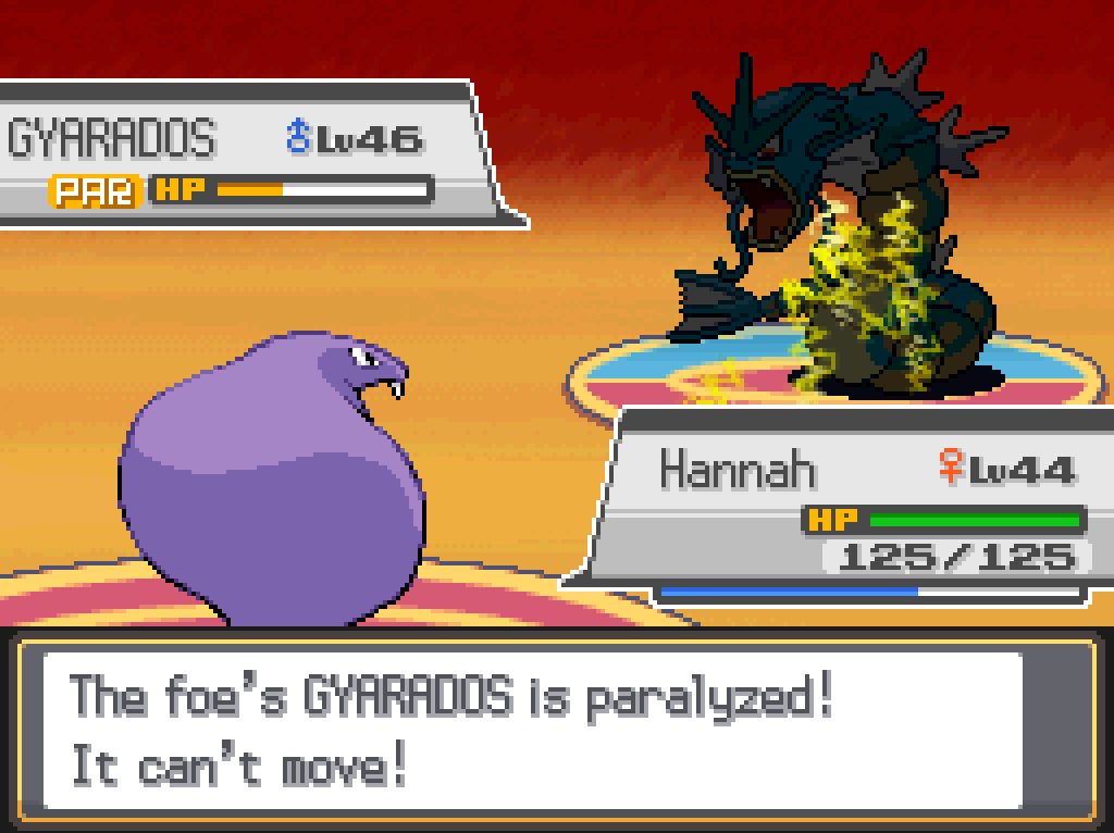 Intimidate and Glare blunt a lot of what Gyarados can do, but this is still a long fight that eats up a six-pack of potions and a big chunk of Hannah’s remaining PP for Crunch and Sludge Bomb (she has some Earthquakes left too, but every member of Lance’s team is a Flying-type, so they’re no good to us).