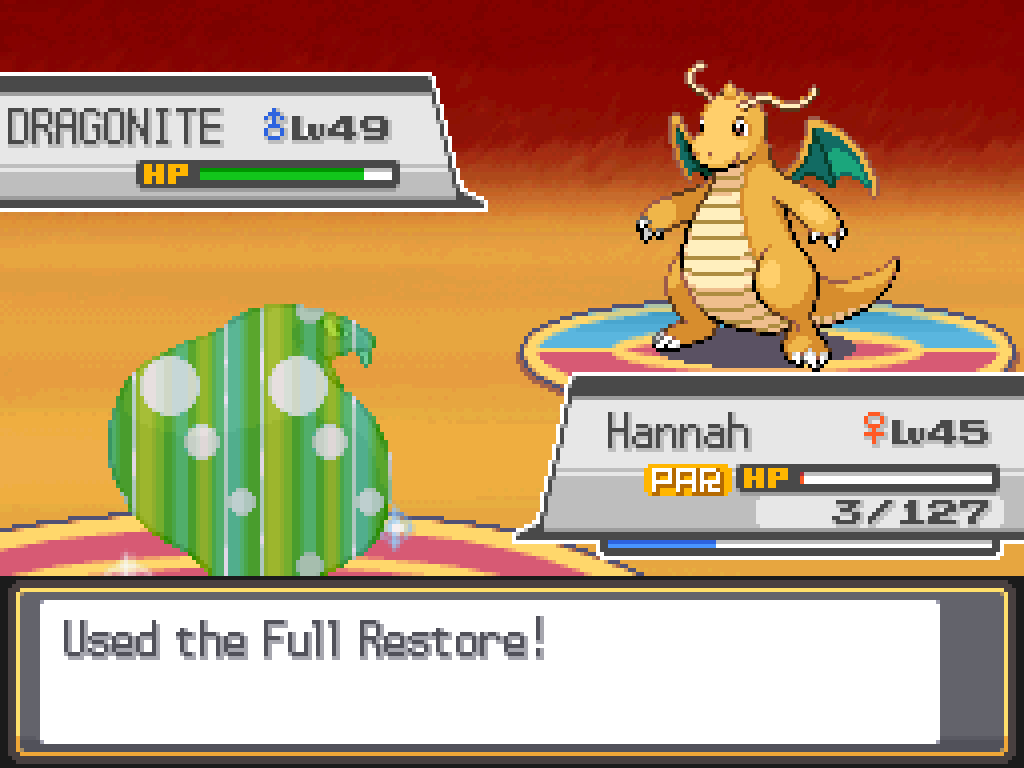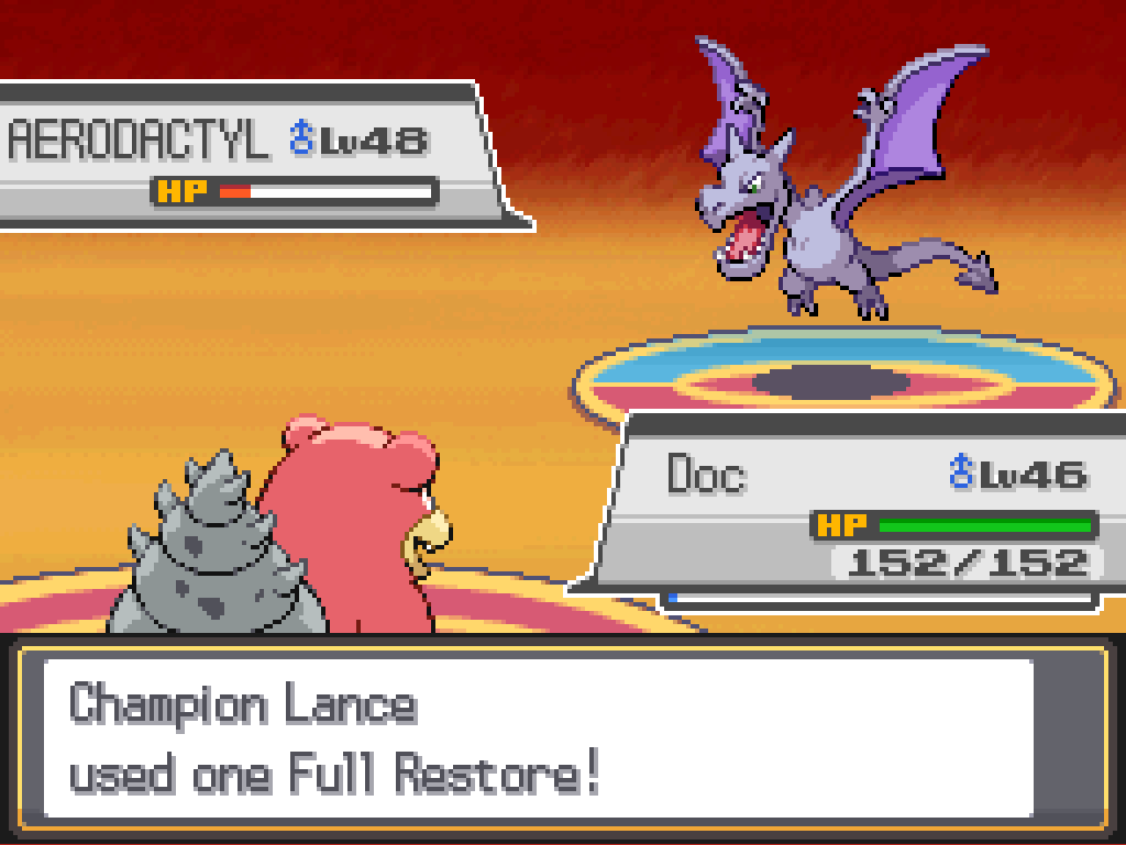 Lance turns out to have not one but two Full Restores in reserve for whichever Pokémon happened to be his last – even if there might have been a more useful time to use them earlier.