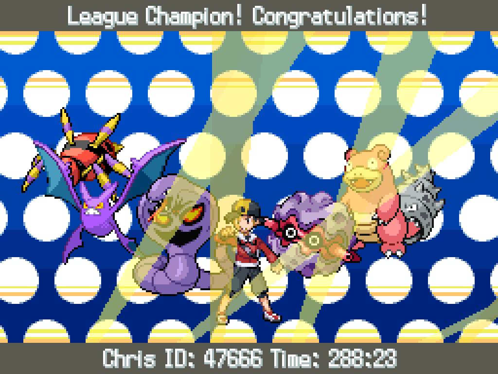 I R winner! Of course there is more to this story – Kanto awaits! I was in two minds about whether to go on after defeating Lance, and the Kingslocke is kinda designed with the standard eight-gym pattern in mind, but I think may as well go all the way to the true end. After all, I think it’s clear that the full meaning of the Prophecy may still be in doubt, and the cards have not yet seen fit to spell out the true end of this story. If you don’t mind, though, I’m going to take a little break – maybe a week or two – before heading out into the mysterious east. This was a battle and a half, and my royal guard needs some time to recover!