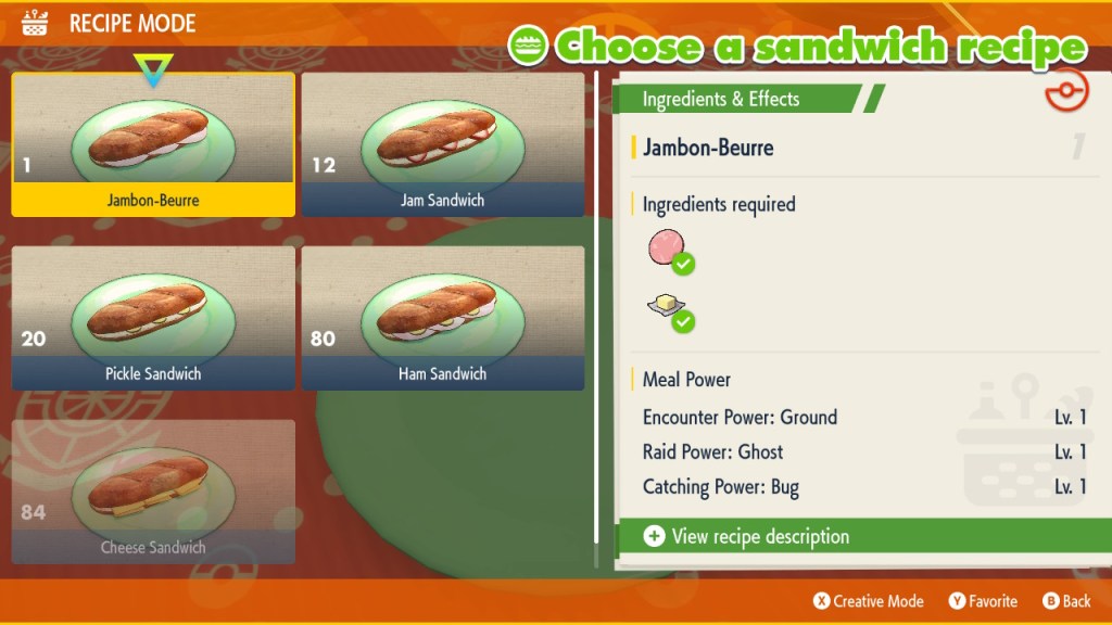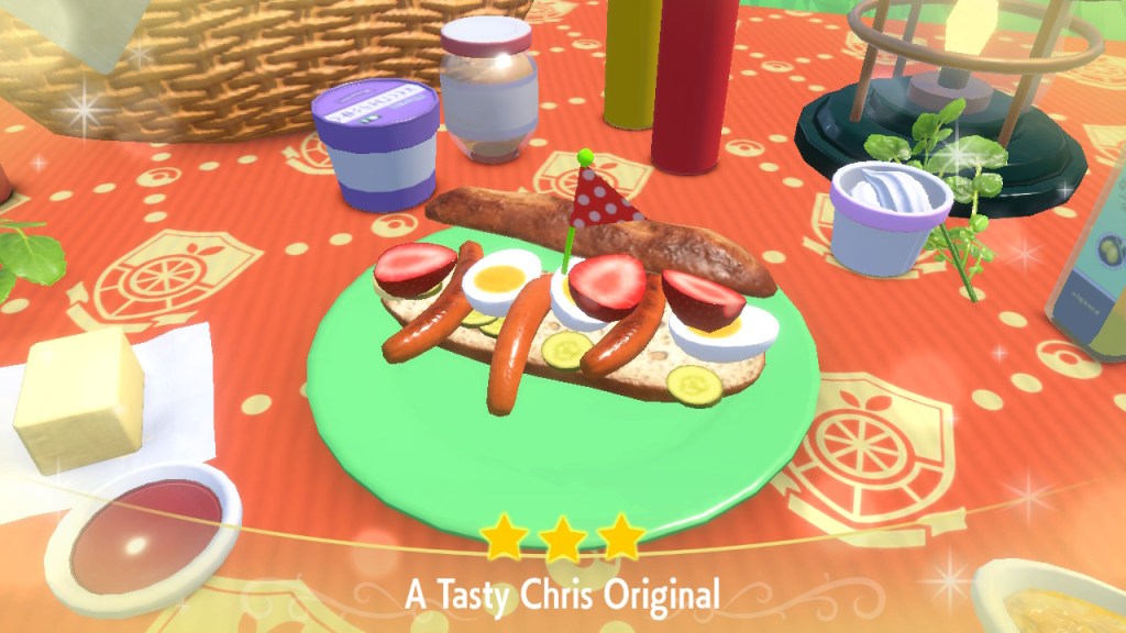 May as well also check out the vaunted sandwich minigame. Making sandwiches can heal your Pokémon in the field and grant them a modest amount of bonus experience, as well as giving you can assortment of utility buffs. You can follow a recipe (and learn new recipes from NPCs in towns), but why would you do that when you can just mash together obviously incompatible ingredients to create a ridiculous frankensandwich?