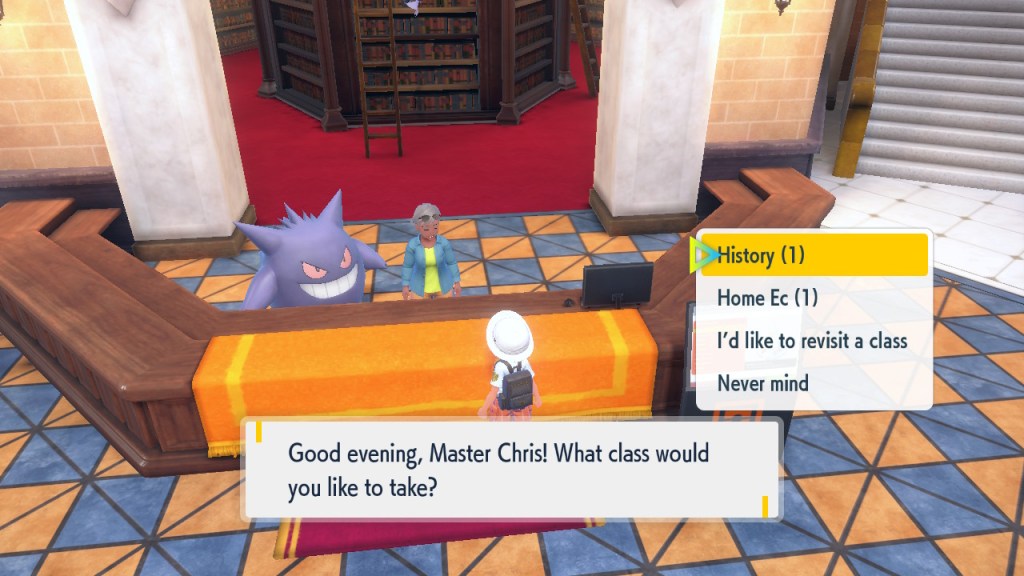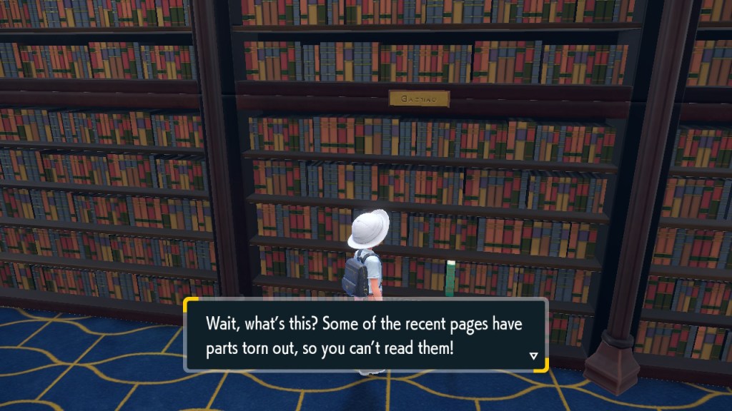 Oh, yeah, as long as I’m back here – I noticed this earlier but forgot to mention it last time.  Along with a pile of interesting lore books about mysterious Pokémon (which, again, I’m sure will be completely incidental to the plot and have no bearing on future events), the library at Naranja Academy has a copy of the student registry.  Pretty dull reading, one imagines – but several pages have been torn out from near the end.  Someone is trying to hide information about a recent enrolment – or expulsion – at the Academy.  Conspiracy is afoot.