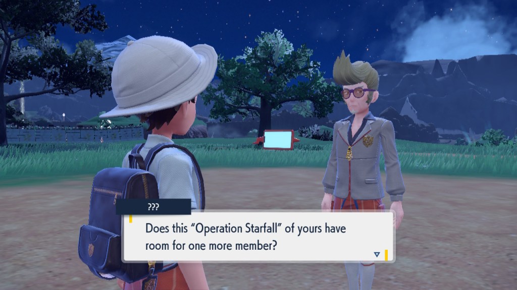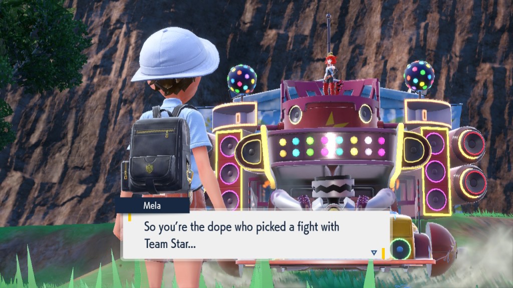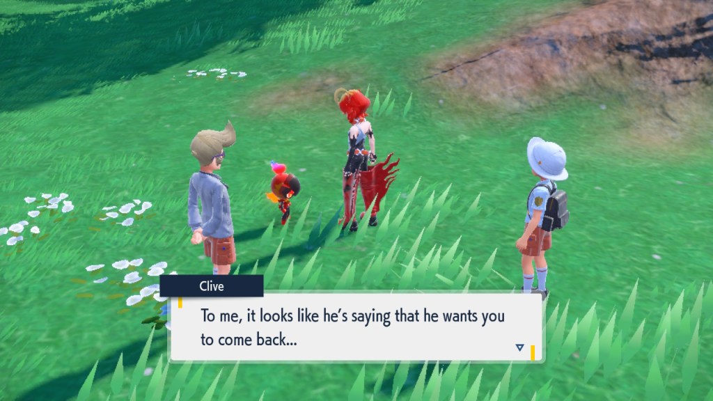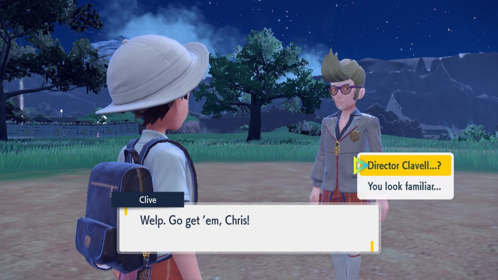 And now we get the real reason Clav- sorry, Clive is here.  He’s been trying to help a Charcadet named Charlos reach Mela.  Mela recognises Charlos as one of several Charcadet she trained at the Academy.  Clive seems to have hoped that meeting a Pokémon she’d helped and being reminded of the good she once did would spur Mela to come back to school.  I don’t know if it’s worked yet, but I think maybe he’s planted a seed.  This is genuinely a very good response to a problem student!  Reminding Mela of her past constructive achievements sends the message that her actions as a Team Star “troublemaker” do not have to define her, and lets her know that there are still other people in her life who will see and appreciate good choices she makes in the future.  It’s a shame a perfectly ordinary student like Clive, who is definitely not Director Clavell in a wig, had to take on that duty, rather than one of the actual teachers, but at least someone at this school knows what they’re doing.