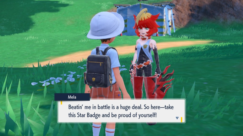 Mela is no joke, and I’ve probably overreached by challenging her so early in the game; her Pokémon are much stronger than mine.  Fortunately, although her Drought Torkoal can put out a lot of damage, she doesn’t seem to have any efficient response to Pokémon with total immunity to Fire.  Against my Charcadet, her damage output is low enough that I can just heal through her attacks and use Nightshade (which doesn’t care about defence stats) to whittle her down.