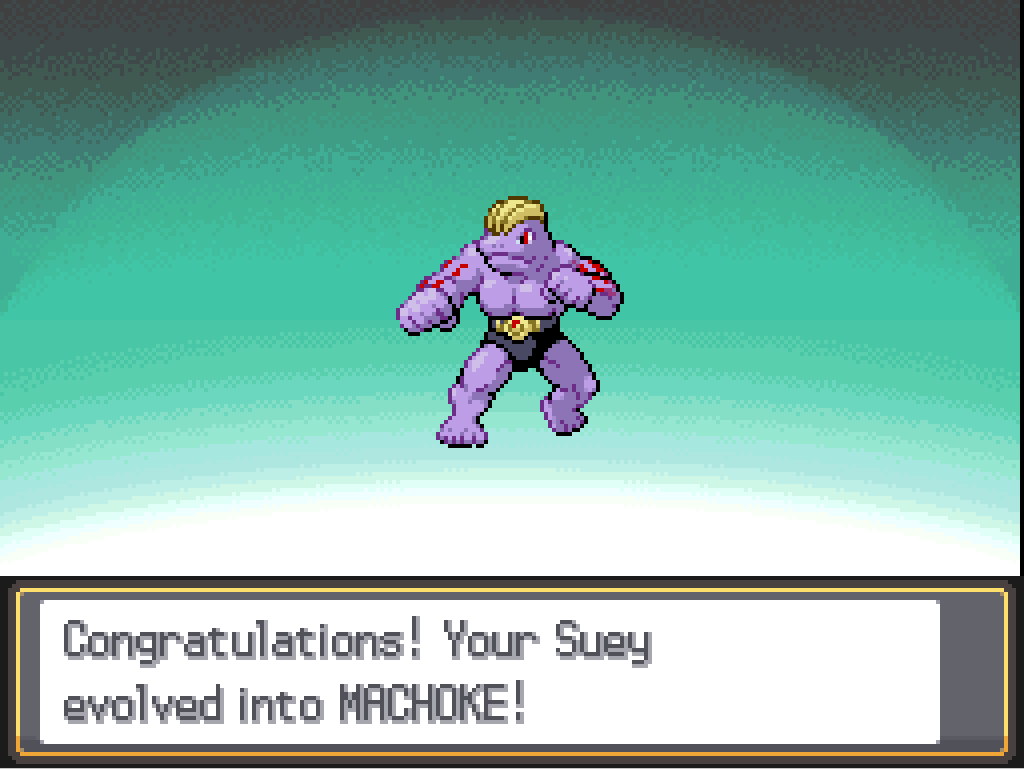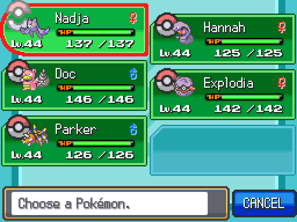 I’m starting off this leg by just… putting a whole lot of Pokémon through basic training. Thanks to the King of Swords, all my lower-level Pokémon can ignore the rules and do whatever they want until they hit 31, and there are actually a lot who can evolve before that point.