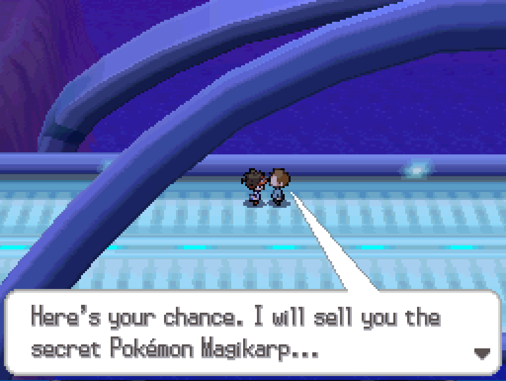 We do, however, encounter our dear globetrotting friend the Magikarp salesman. Pokémon you receive from NPCs are fair game in a Kingslocke, so…
