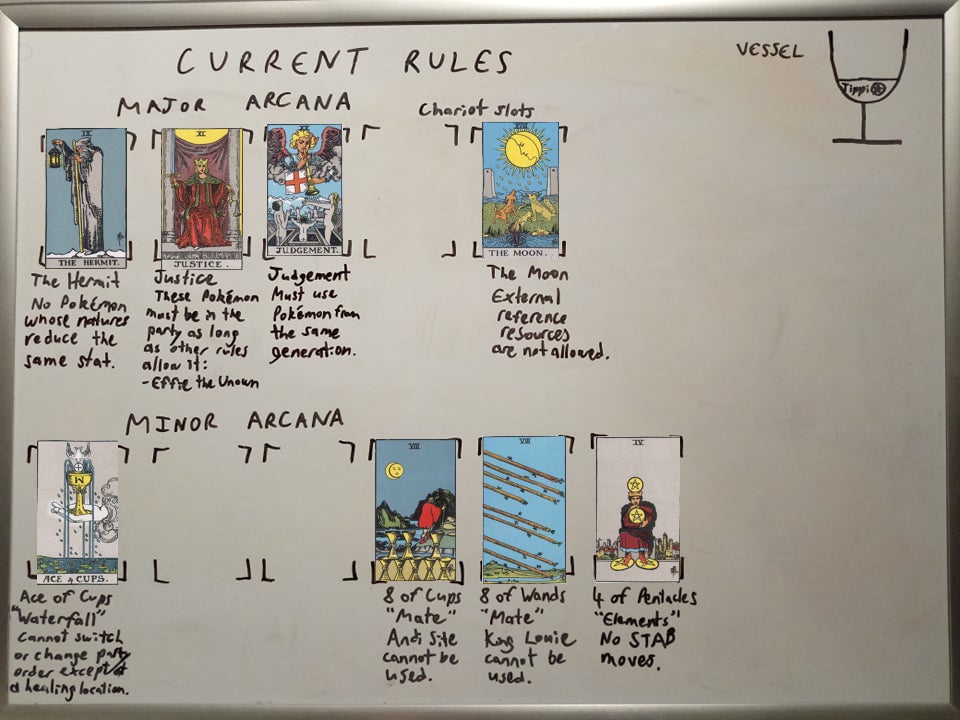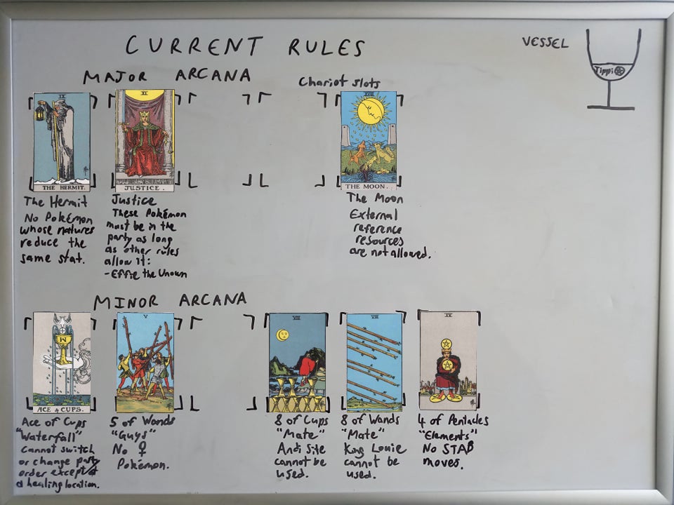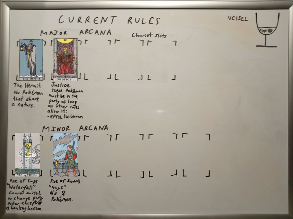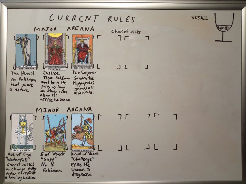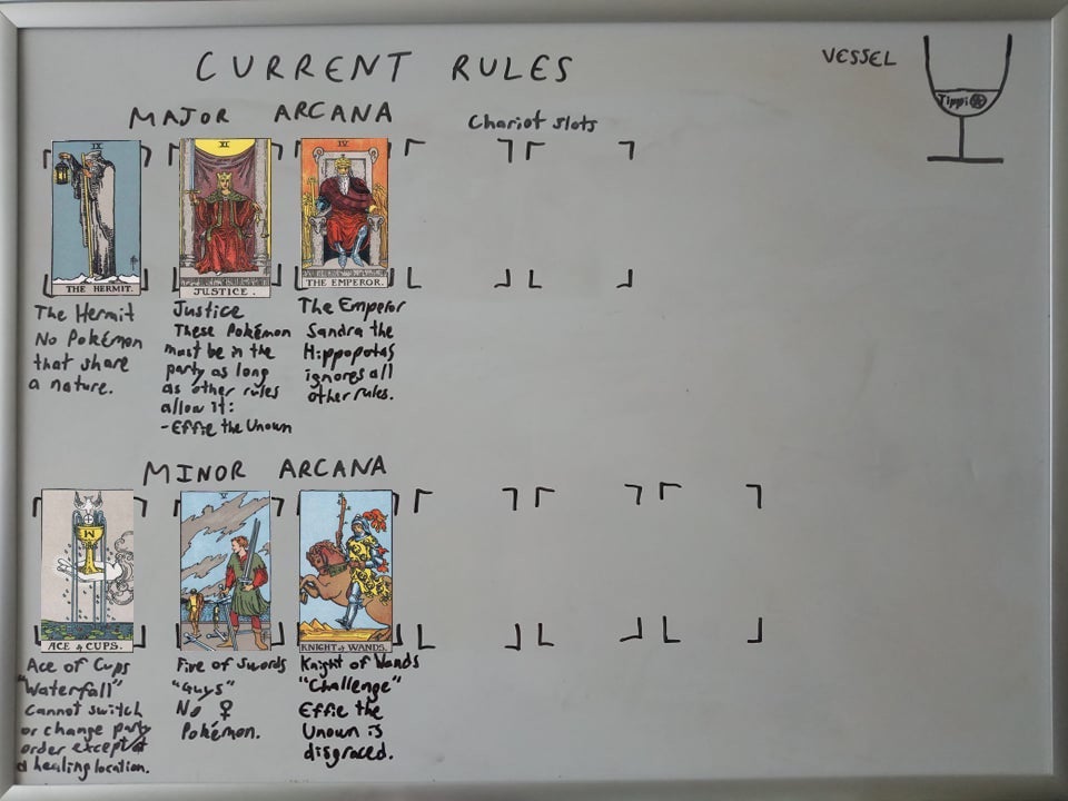 So – last time I’d just finished training a moderately competent team on Iron Island out of the Pokémon assigned to me by the Devil (look, this is just the kind of phrase you wind up using in this run; deal with it), only to draw the Five of Pentacles when I entered the gym and learn that I won’t be allowed to use any female Pokémon.