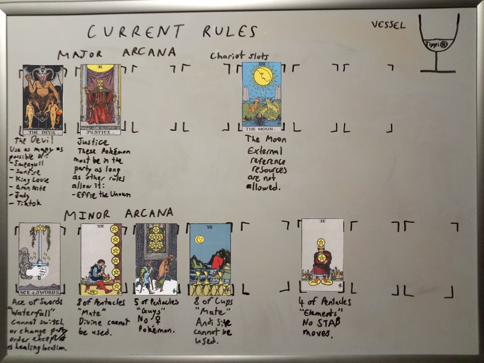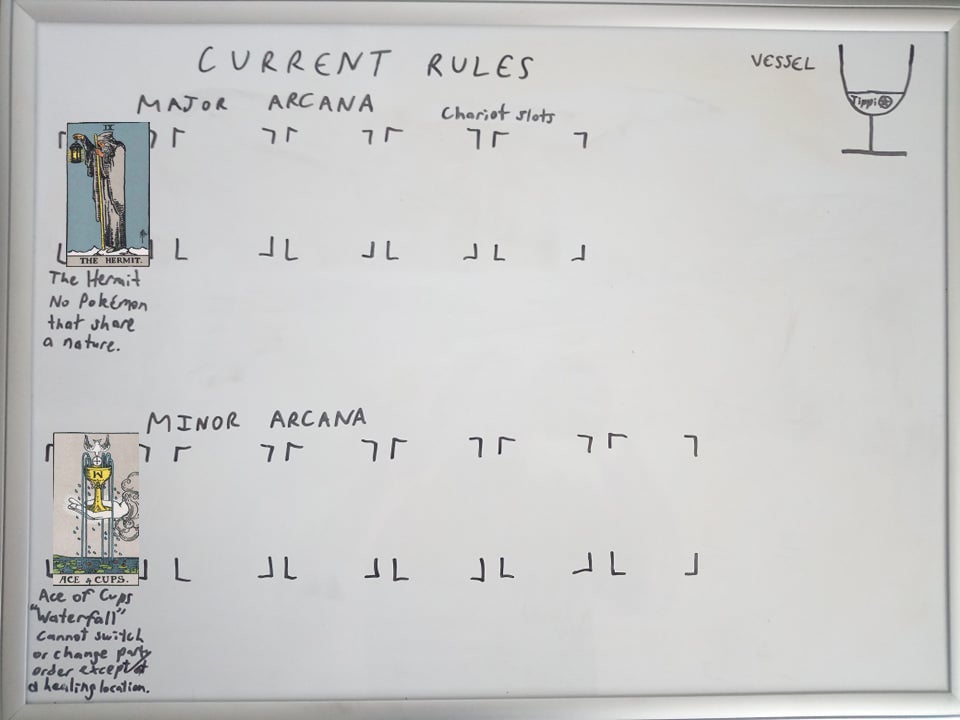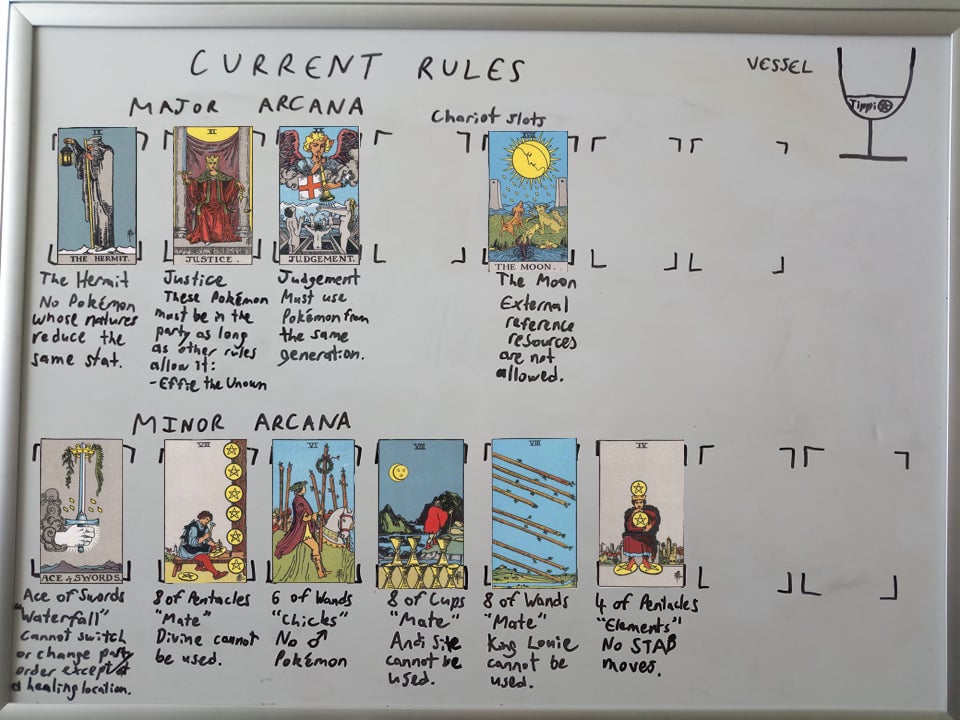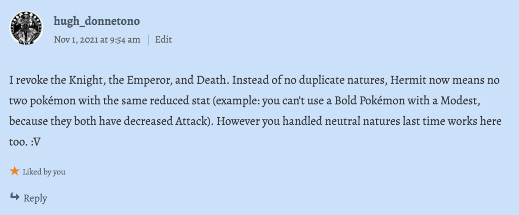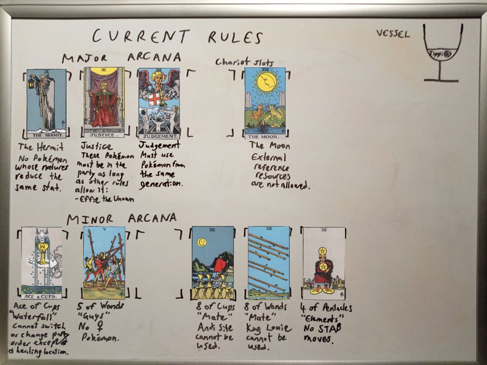 So – last time I’d just finished training a moderately competent team on Iron Island out of the Pokémon assigned to me by the Devil (look, this is just the kind of phrase you wind up using in this run; deal with it), only to draw the Five of Pentacles when I entered the gym and learn that I won’t be allowed to use any female Pokémon.