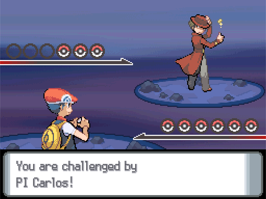 Something really funny about Diamond and Pearl is that they come at a point in the Pokémon series before anyone had actually made Game Freak stop putting fµ¢£ing casinos in all their games for small children, but after Nintendo had kinda figured out they should probably tone down the gambling references, at least for the international market (and, y’know, also long before the emerging mobile games industry would totally normalise the idea of designing video games to get children to gamble). Thus, we have the PI (Private Investigator) trainer class. These guys are shown tossing coins in their sprites and their dialogue is all about luck, chance and guessing, which makes them seem like pretty rubbish private investigators. They also use a lot of very luck-heavy moves – Carlos here has three Goldeen, all of whom know Horn Drill. This is because, in the original Japanese, they’re not investigators. They’re gamblers – a trainer class that appears in the Kanto games, both original and remakes, and returns in Let’s Go Pikachu and Eevee renamed “gamers.” The generation IV gambler just happened to have this noir-style sprite with the long coat and fedora that could believably be renamed “PI” in translations – not a switch you could easily pull with the generation III gambler, who is an old man with threadbare clothes and a dice cup.