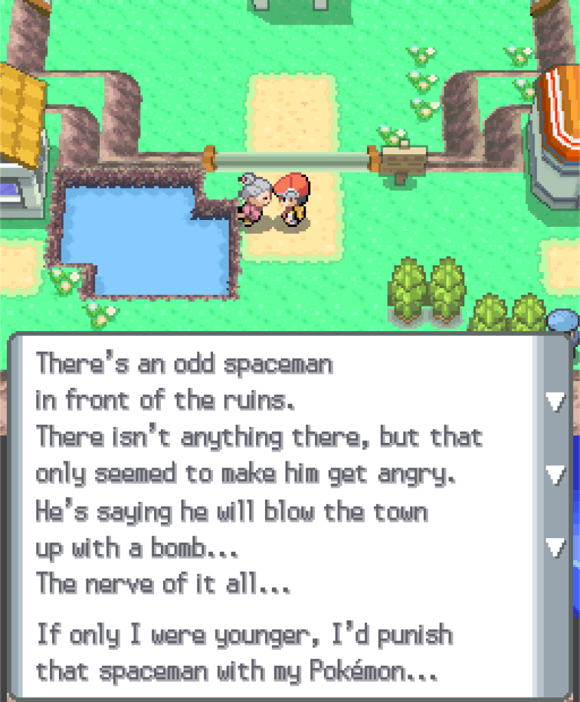 So there’s a Team Galactic goon here being a goon and doing goon things. Maybe Cynthia knew all about this and realised someone had to go and deal with it, but didn’t want to have to speak to her grandmother, so she engineered a bull$#!t pretext for the player to go to Celestic Town instead.