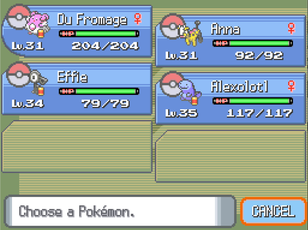 Look, I know everyone was eager to see me take on Canalave City with only a drastically underlevelled Blissey and Girafarig, an Unown and a Blizzard/Slam Quagsire, but I felt like I had to do just a teensy bit of off-screen grinding, maybe not quite enough to get Du Fromage and Anna up to the levels of the old team, but enough for them to be… well, competent.