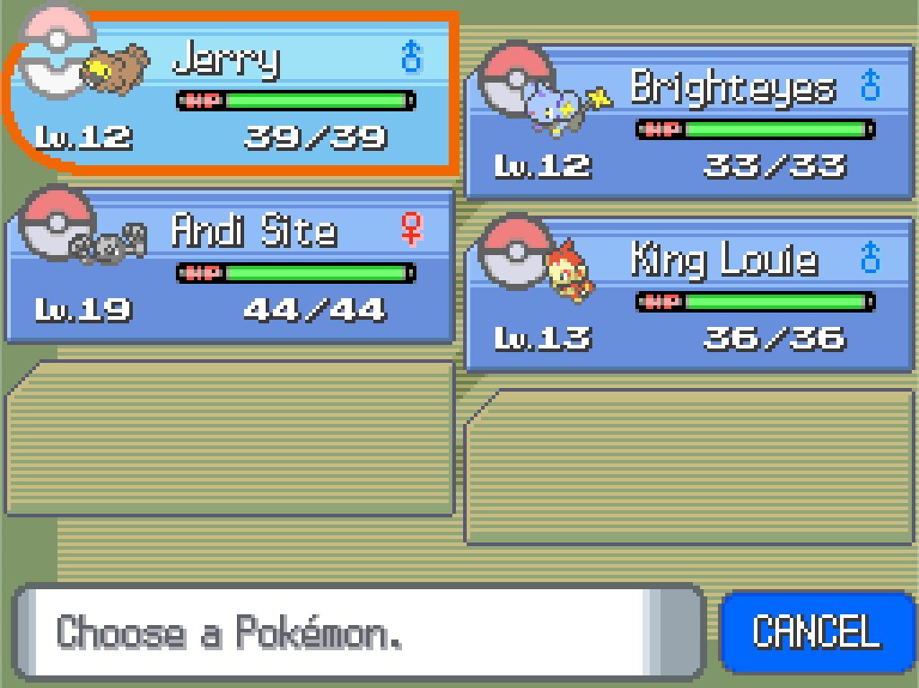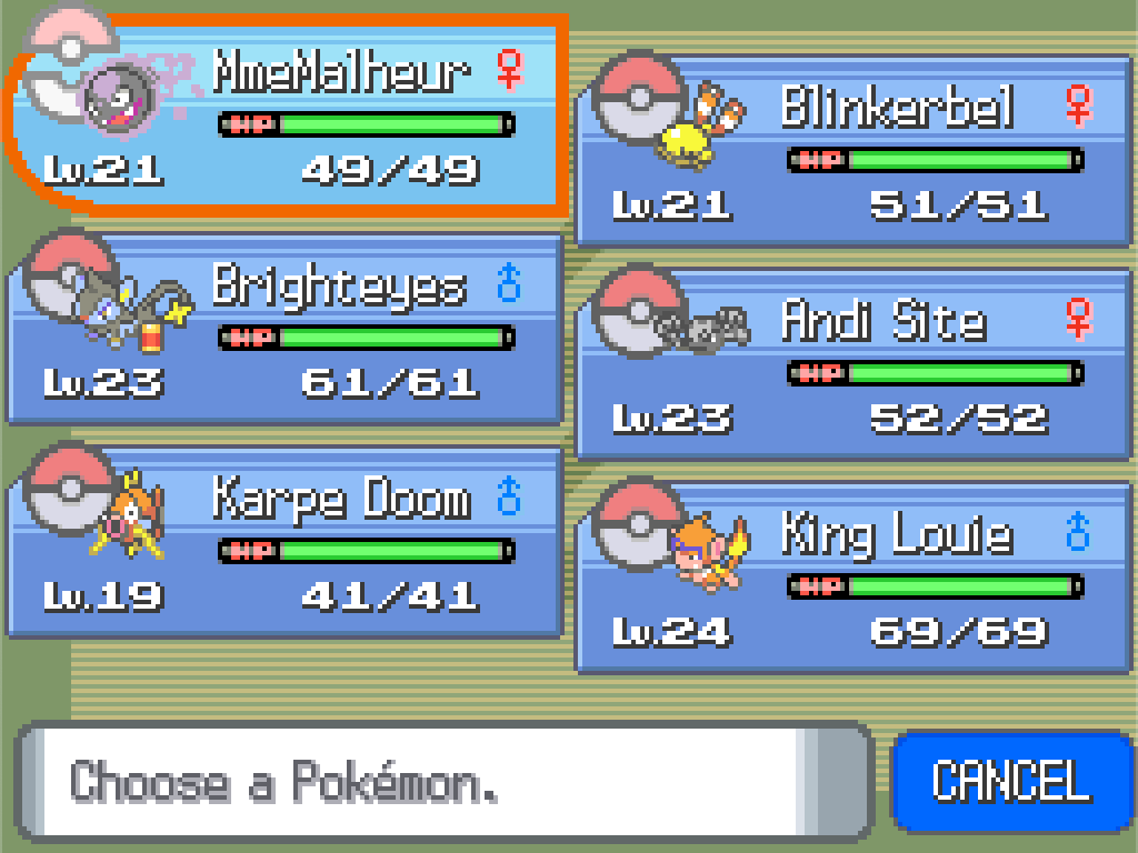 I wanted to train the boys a little bit higher, but with limited Pokémon Centre visits, there’s only so much potions can do; they don’t restore PP (and I’m even running out of money for potions).