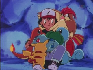 Pikachu’s Goodbye and Snow Way Out prominently display Ash’s sense of responsibility, which seems to be a significant part of what being a trainer means for him. He is supposed to keep his Pokémon happy, healthy and strong, and faced with a potential life-or-death situation his top priority is to protect them (I’m not convinced that wrapping his Pokéballs in his jacket actually affords his Pokémon any additional protection from the cold, but clearly Ash believes it does, and cares more about that than about keeping warm himself). Way back in I Choose You, Ash related to Pikachu as a master to an underling, and Pikachu very nearly died; the traumatic events of Ash’s first day as a trainer have almost certainly stayed with him, and I suspect those memories may be a factor in his overwhelming instinct that he has a duty to keep his Pokémon safe, especially Pikachu (nearly losing Metapod in Challenge of the Samuraimight well be weighing on him too). This doesn’t apply so much to battles; any reasonable trainer will pull a Pokémon out of a fight if it’s taking too severe a beating, and Ash is no exception, but he’s generally fine with having his Pokémon stay in and tough it out until things get truly dire. This is presumably because Ash, like most humans in the Pokémon universe, regards battles as being beneficial for Pokémon on some level; it’s how they grow stronger and learn about their own powers. The moment he begins to feel that one of his Pokémon is in genuine danger, though, Ash will act quickly and often recklessly to deal with the threat.