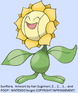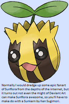 Unlike Sunflora, there’s no reason Spinda shouldn’t evolve, so we have plenty of latitude to change his movepool, abilities, stats, and even type. Spinda has two abilities that are worryingly situational at best, so I think the most straightforward thing to do is change them for new ones that fix Spinda’s main problem (the fact that confusion, compared to the five primary status effects, is simply not very debilitating) by imposing additional penalties on confused Pokémon while Spinda is in play. Confusion represents a failure of a Pokémon’s strength of will, which is commonly connected with special attack or special defence, so I want one ability to automatically weaken both of those stats when a Pokémon becomes confused while Spinda is in play (the penalty stays in place after the confusion wears off, or if Spinda switches out, and can be triggered by self-induced confusion such as Petal Dance causes). This ability is geared at making it impossible for a confused Pokémon to do anything but switch out to shake off the penalties. For the other, let’s take the opposite route: confused Pokémon cannot switch out while Spinda is in play; they can only stay in and suffer. If Spinda uses Baton Pass to switch out to another Pokémon, the confused Pokémon stays trapped (the same way Mean Look used to work and inexplicably no longer does), but only as long as it stays confused. Spinda’s evolution should have strong defences so he can switch into some attacks without the benefit of resistances, and high speed to be able to fire off a Teeter Dance before being attacked, but his damage potential should remain low to encourage him to keep to his customary support role. Likewise, his offensive movepool should not be notably expanded (his enormous support movepool should be enough for anyone once he has the stats to back it up). As for flavour… Spinda’s evolution has spots that, impossibly, seem to move. In fact, when researchers look at a photograph, it has no spots at all… but when the photograph is held up next to the real Pokémon, the spots seem to mysteriously reappear. The light-twisting properties of its shimmering fur can cause people to see what they expect to see, rather than what is really there, and its form appears to distort subtly as it moves, causing headaches in anyone that tries to focus on it. Other Pokémon who lock eyes with it feel compelled to imitate its unsteady, lurching walk, dazing them and limiting their movements, but however erratically this Pokémon walks, it always seems to reach its destination as quickly as if it had gone in a straight line.